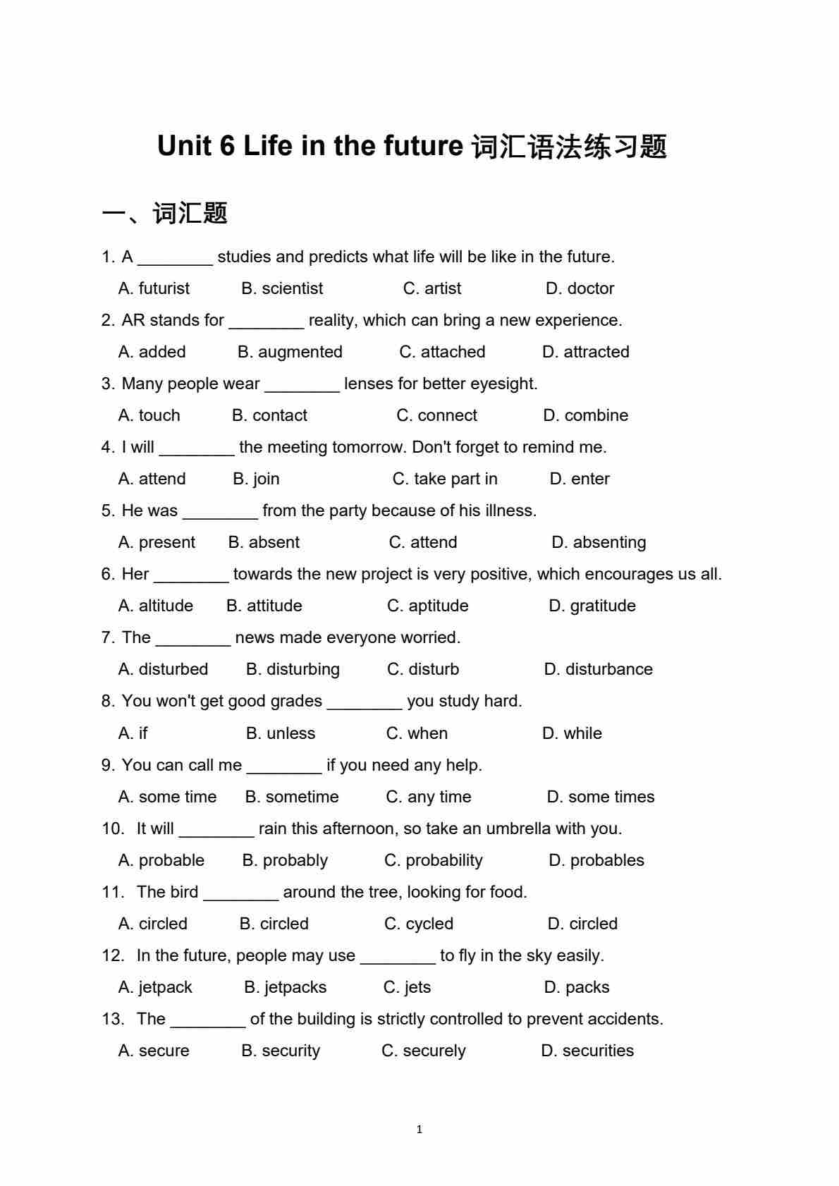 沪教54版---Unit 6 Life in the future词汇语法练习题(含答案解析)【沪教版(五四学制)(2024)八上英语】