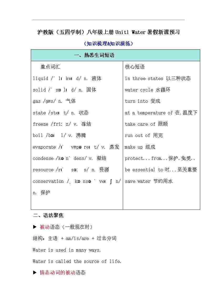 (2024)八年级上册Unit 1 Water 暑假新课预习(含答案) 沪教版(五四学制)