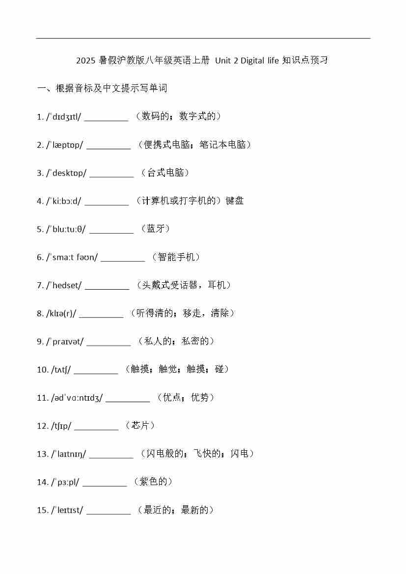 (2024)八年级上册Unit 2 Digital life知识点预习(含答案)2025年暑假沪教版沪教版(五四学制)