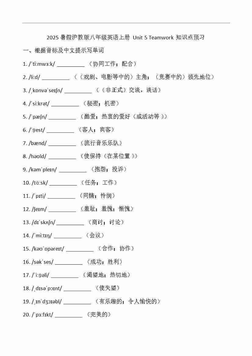 (2024)八年级上册Unit 5 Teamwork知识点预习(含答案)2025年暑假沪教版(五四学制)