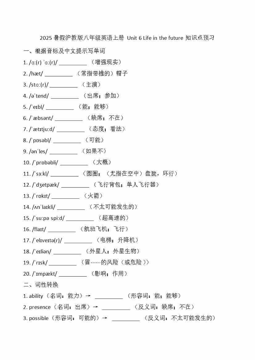 (2024)八年级上册Unit 6 Life in the future知识点预习(含答案)2025年暑假沪教版(五四学制)