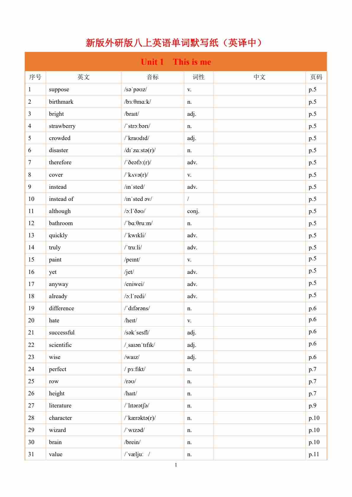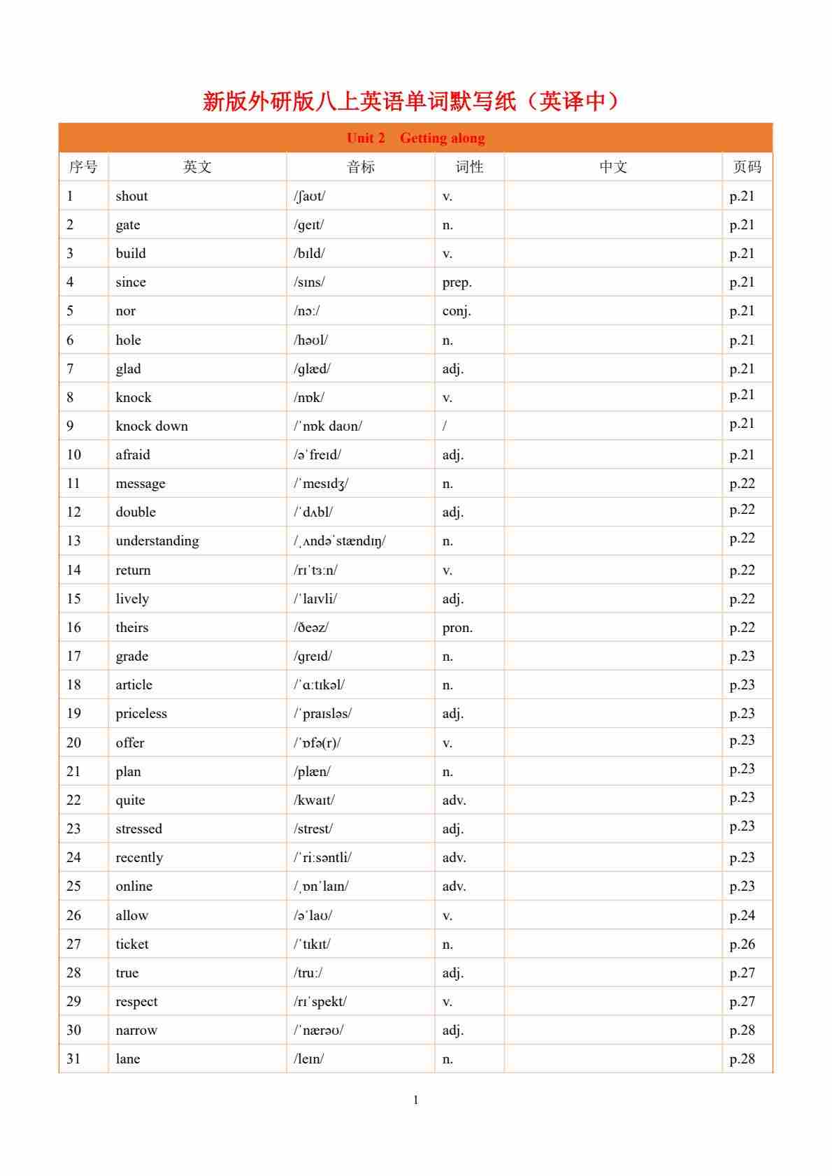 25年秋新外研版八上Unit1 英译中