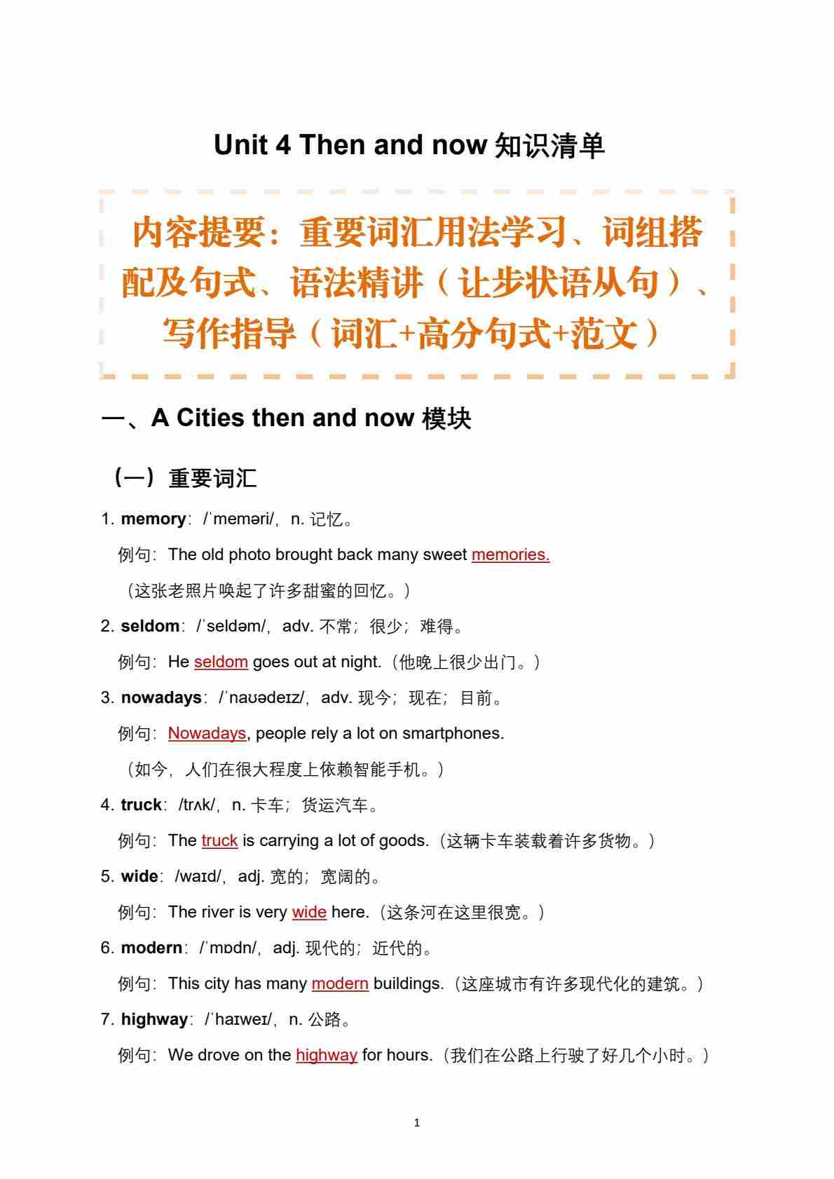 Unit 4 Then and now知识清单(含写作指导))【沪教版(五四学制)(2024)八上英语】