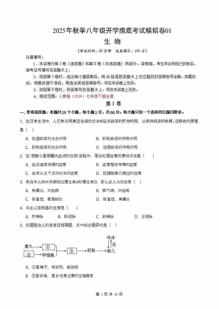 2025年八年级生物秋季开学摸底考01(人教版2024)(考试版A4)