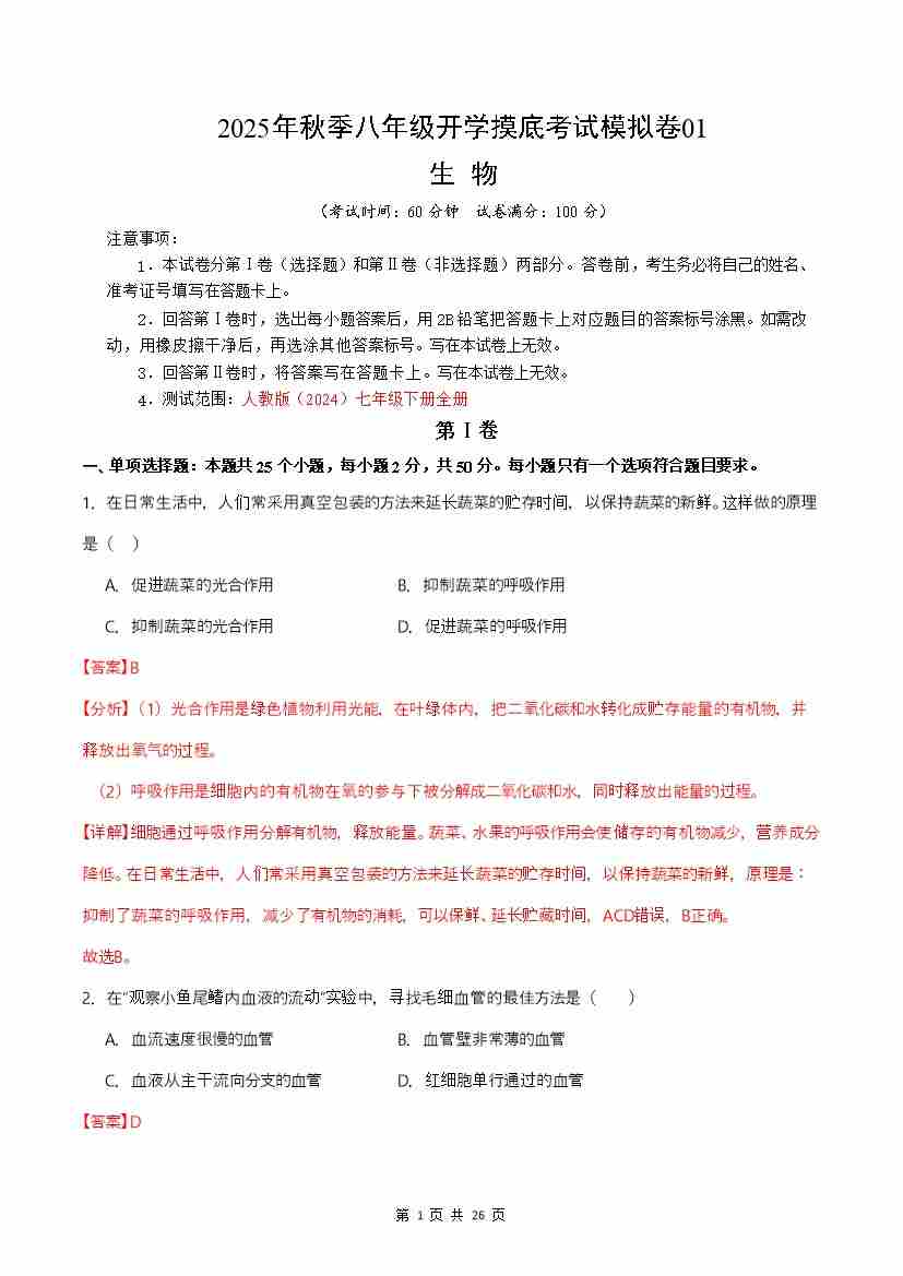 2025年八年级生物秋季开学摸底考01(人教版2024)(解析版)