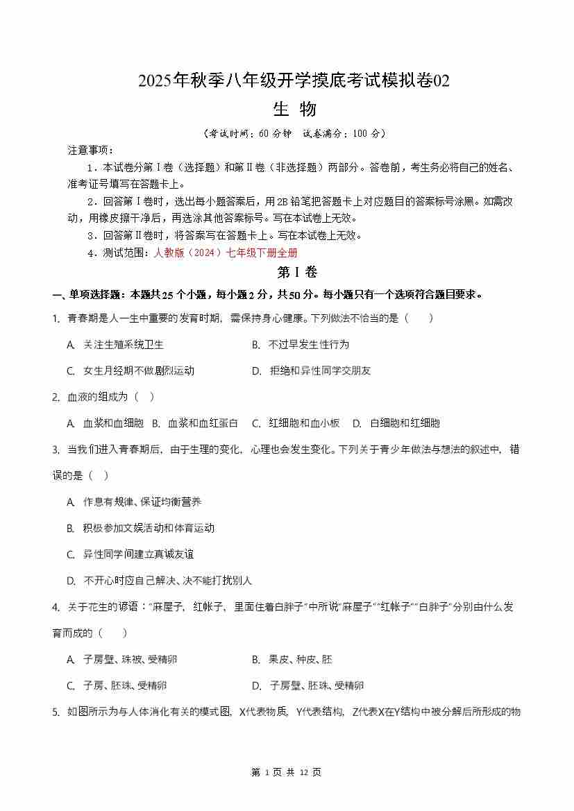 2025年八年级生物秋季开学摸底考02(人教版2024)(考试版A4)