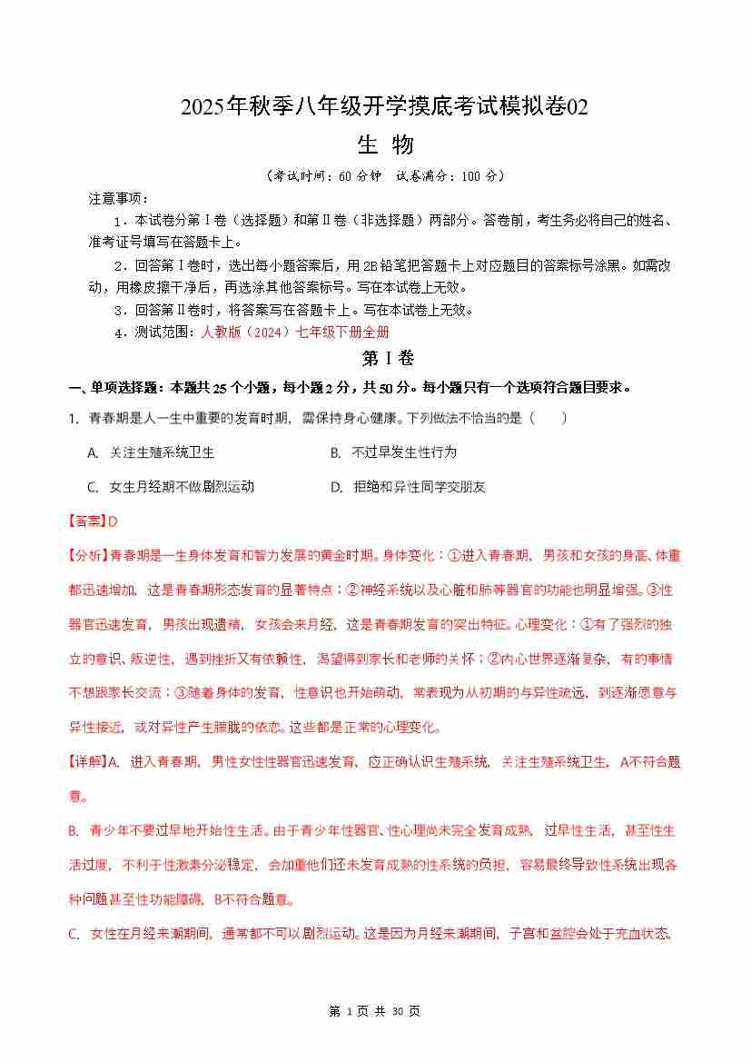 2025年八年级生物秋季开学摸底考02(人教版2024)(解析版)