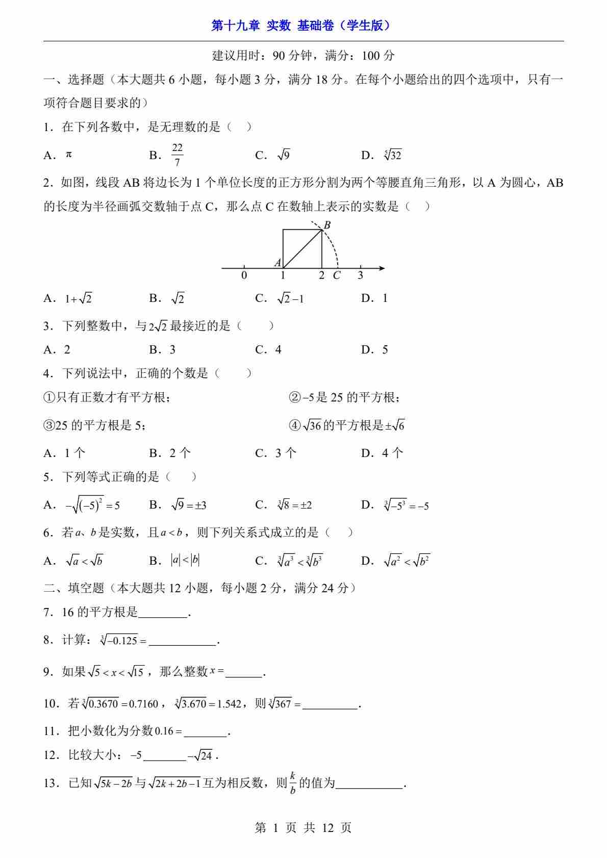 第19章 实数(单元测试·基础卷)(考试版A4)