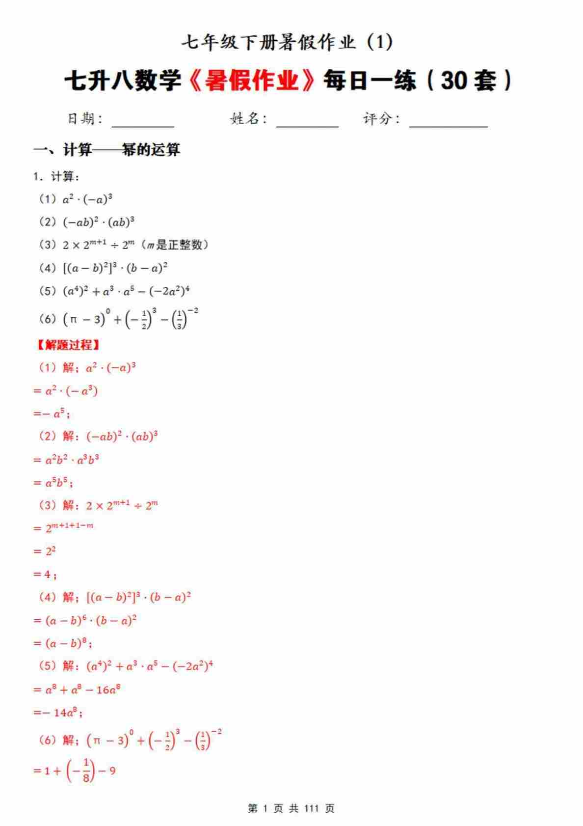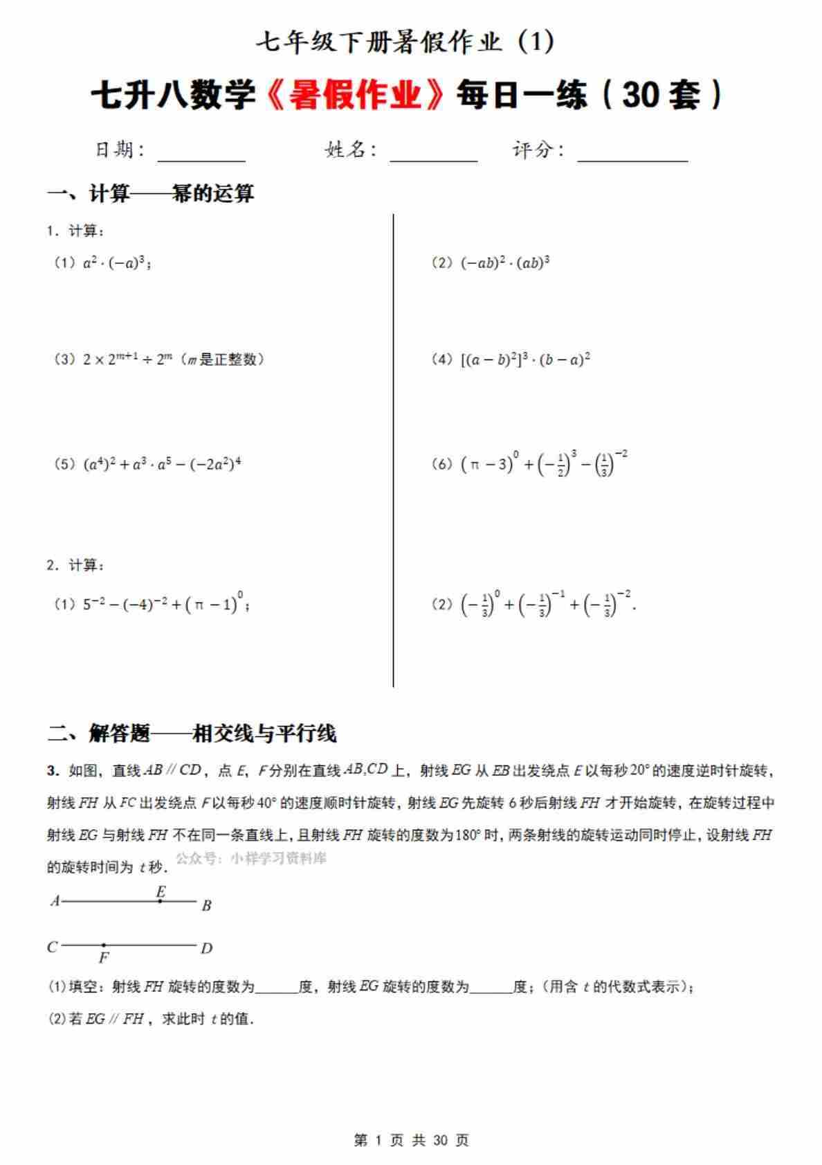 七下数学北师版暑假作业每日一练(原卷版)(2)