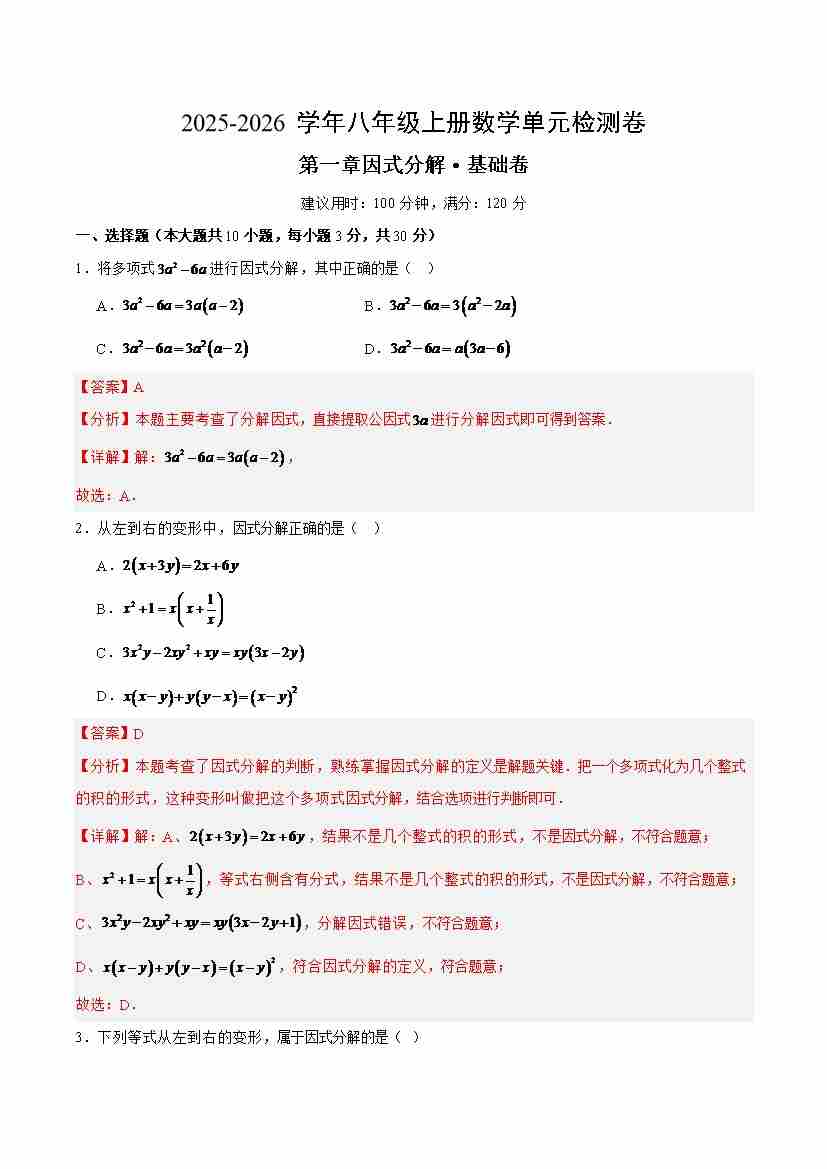 第一章因式分解 基础卷测试(解析版)