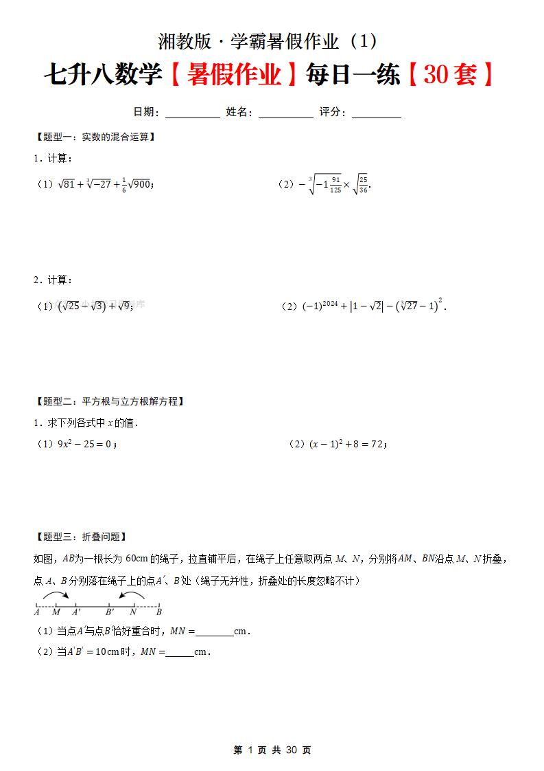 七年级下册数学暑假每日一练【湘教版】原卷版1