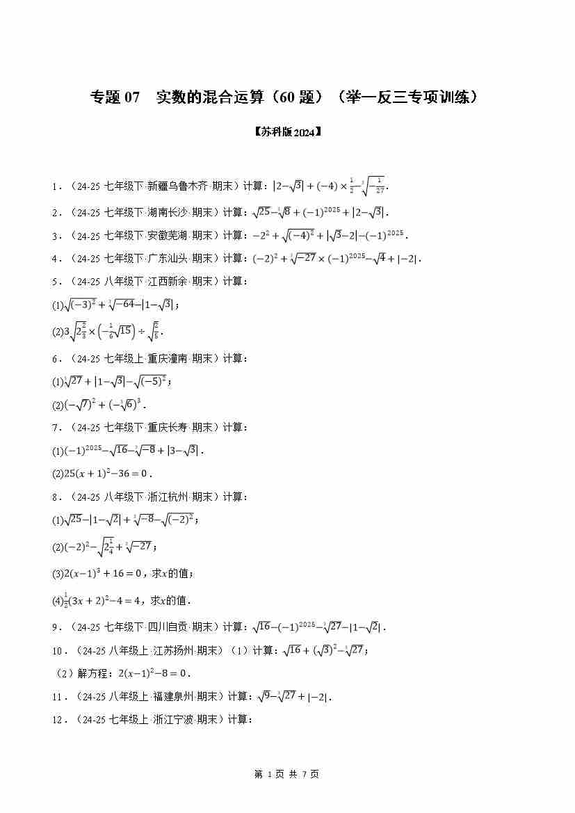【苏科】专题07 实数的混合运算(60题)(原卷版)
