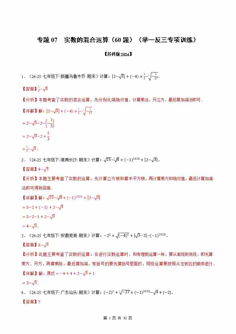 【苏科】专题07 实数的混合运算(60题)(解析版)
