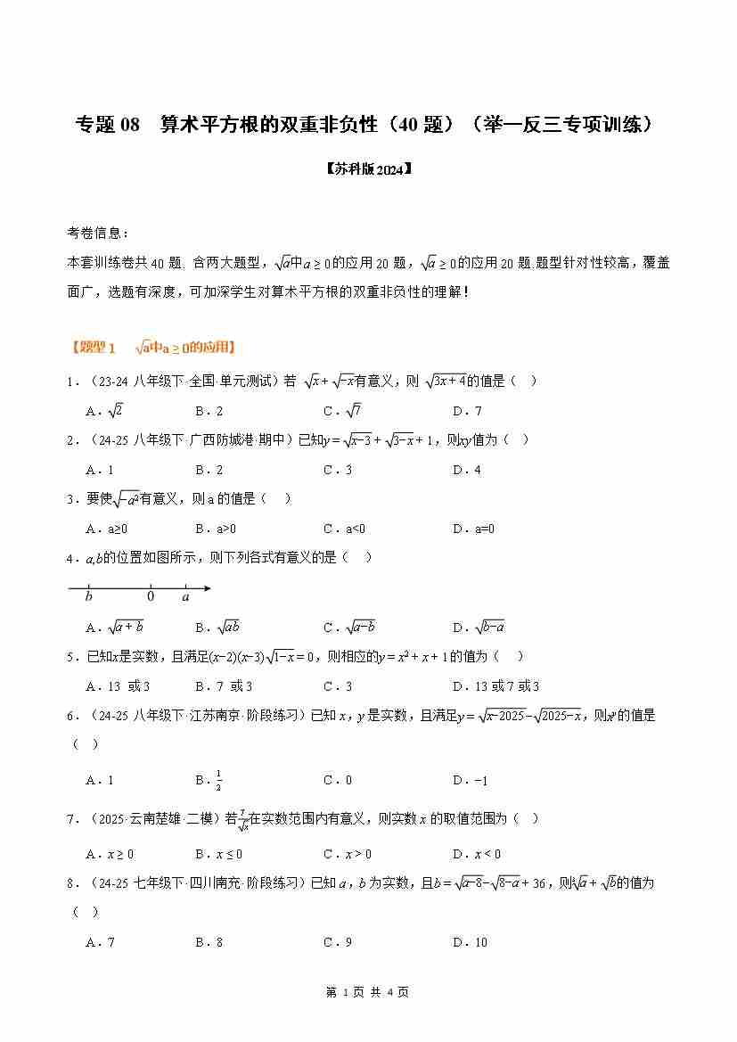 【苏科】专题08 算术平方根的双重非负性(40题)(原卷版)