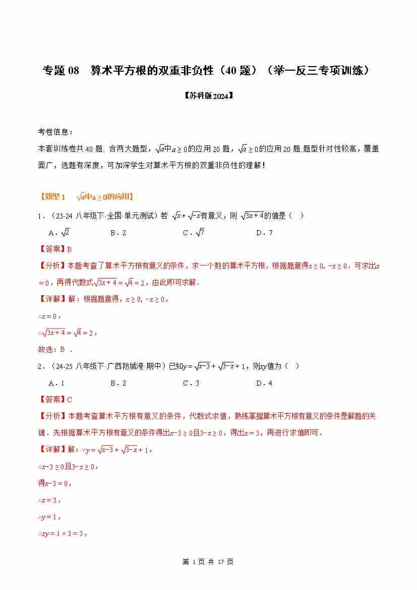【苏科】专题08 算术平方根的双重非负性(40题)(解析版)