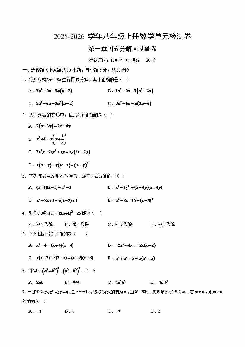 第一章因式分解 基础卷测试(考试版A4)