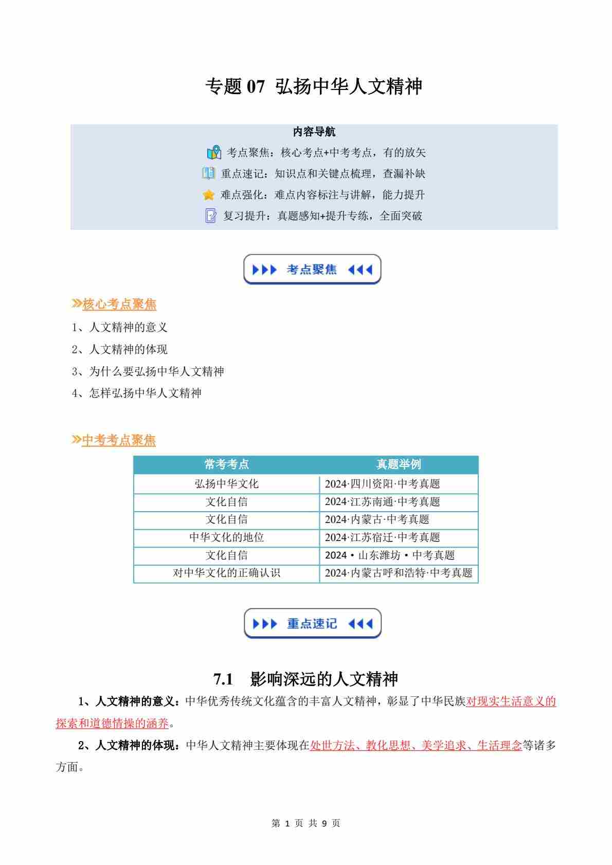 专题07 弘扬中华人文精神(原卷版)