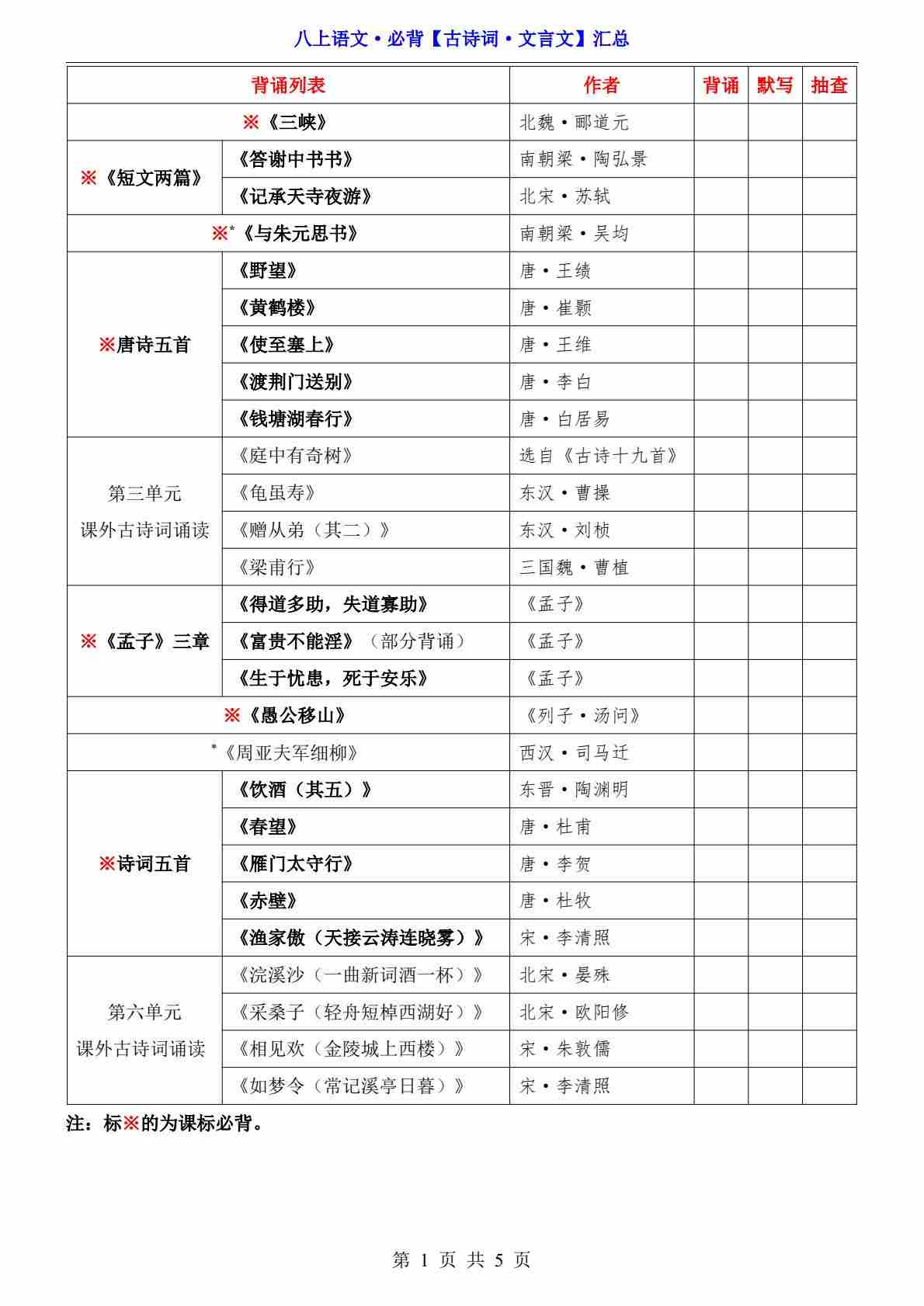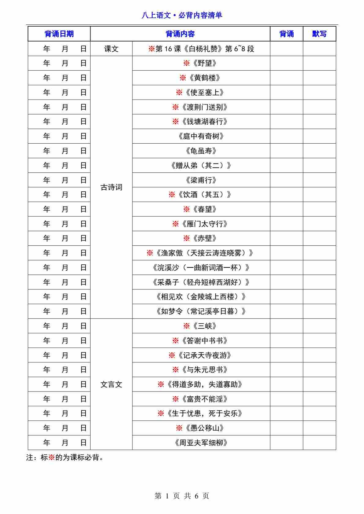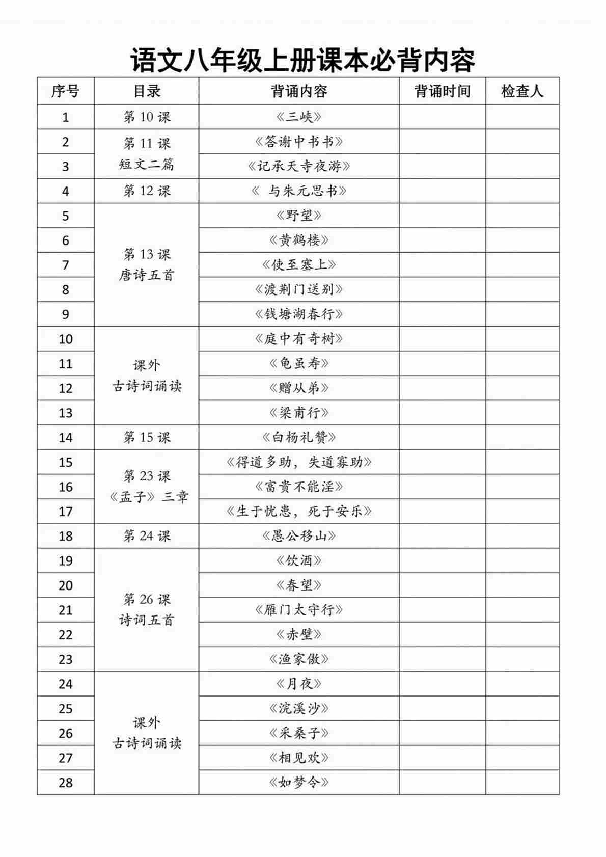 八上语文必背内容清单(含计划表)部编版