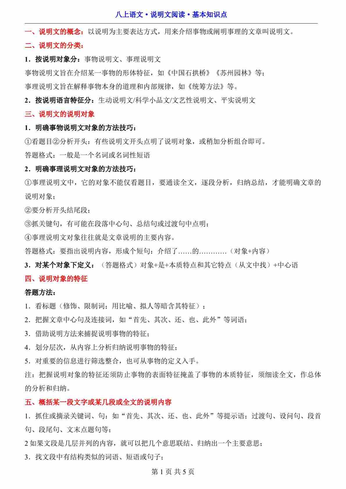 八上语文说明文阅读基本知识点部编版