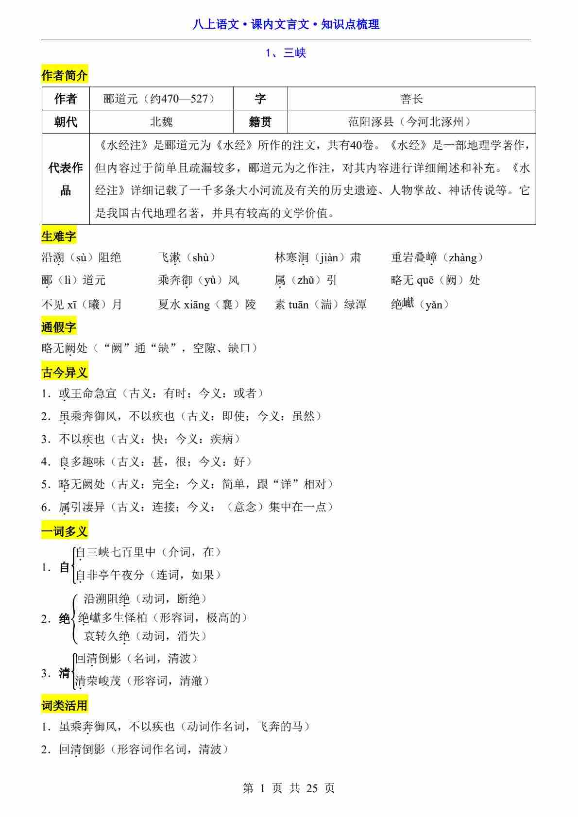 八上语文课内文言文知识点梳理部编版