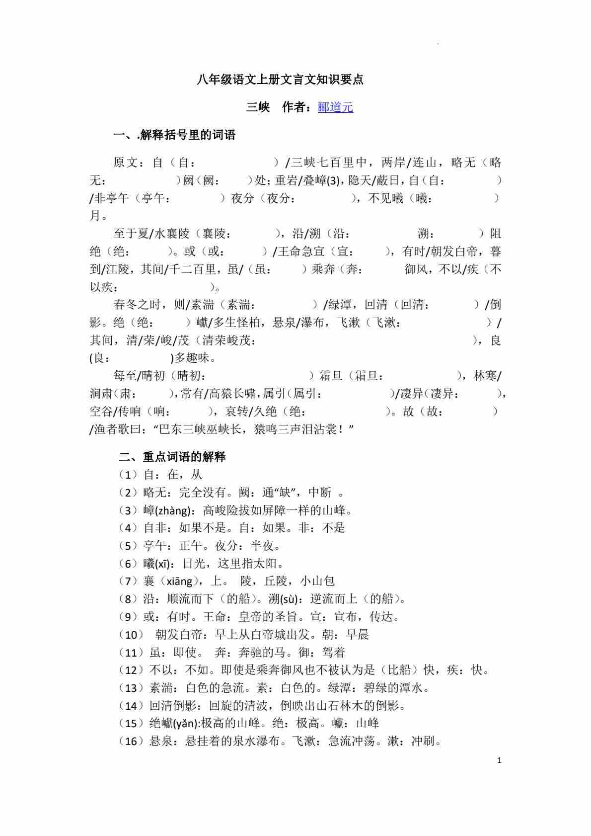 八上语文课内文言文知识点汇总部编版