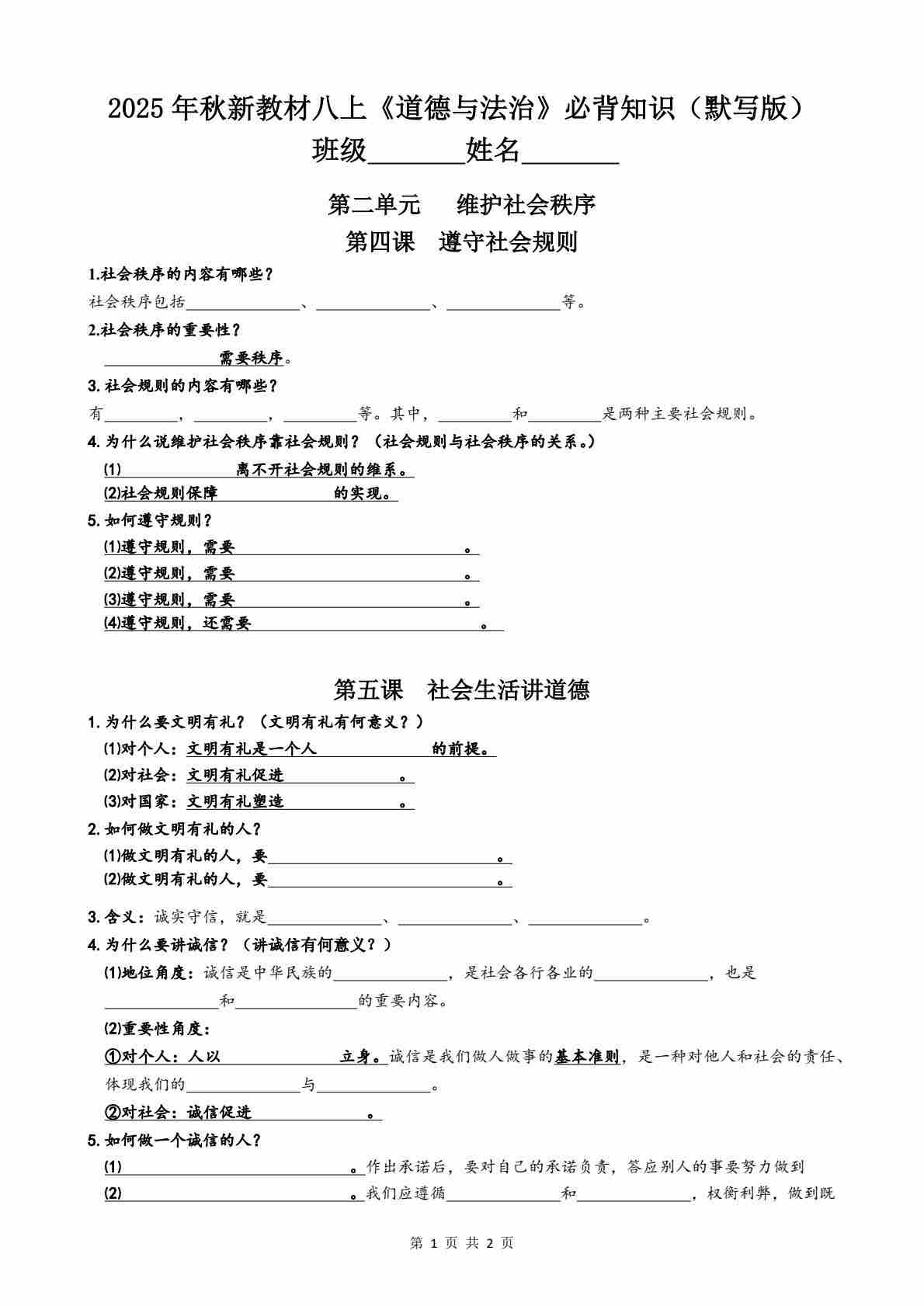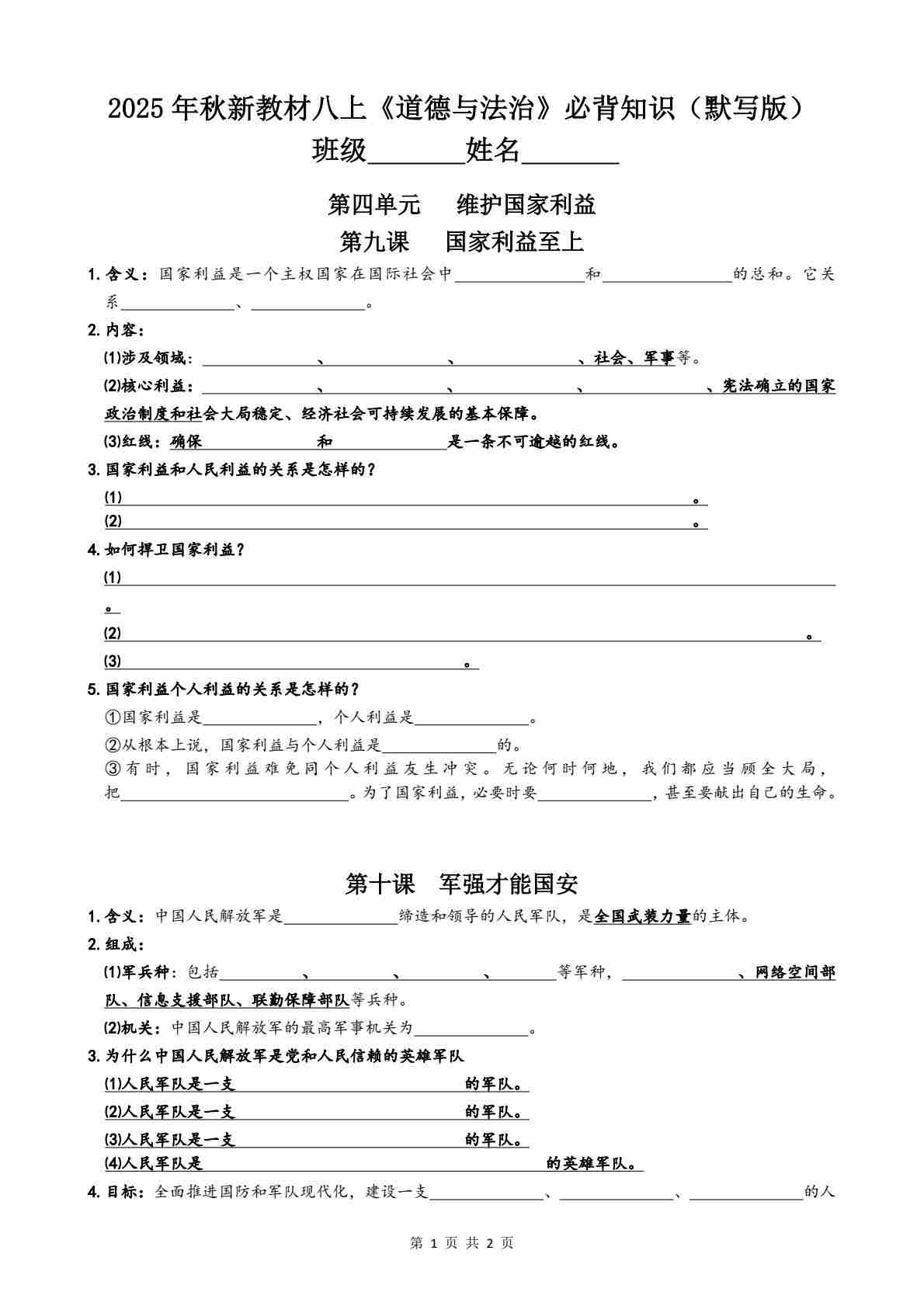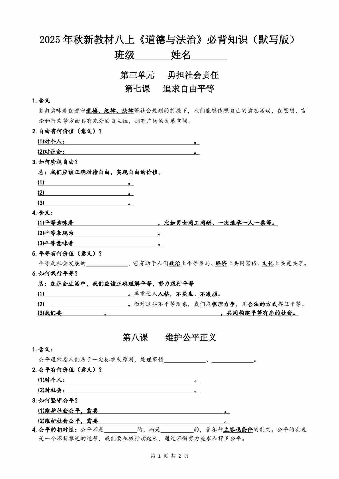 2025年秋新教材八上《道德与法治》第2单元必背知识(默写版)