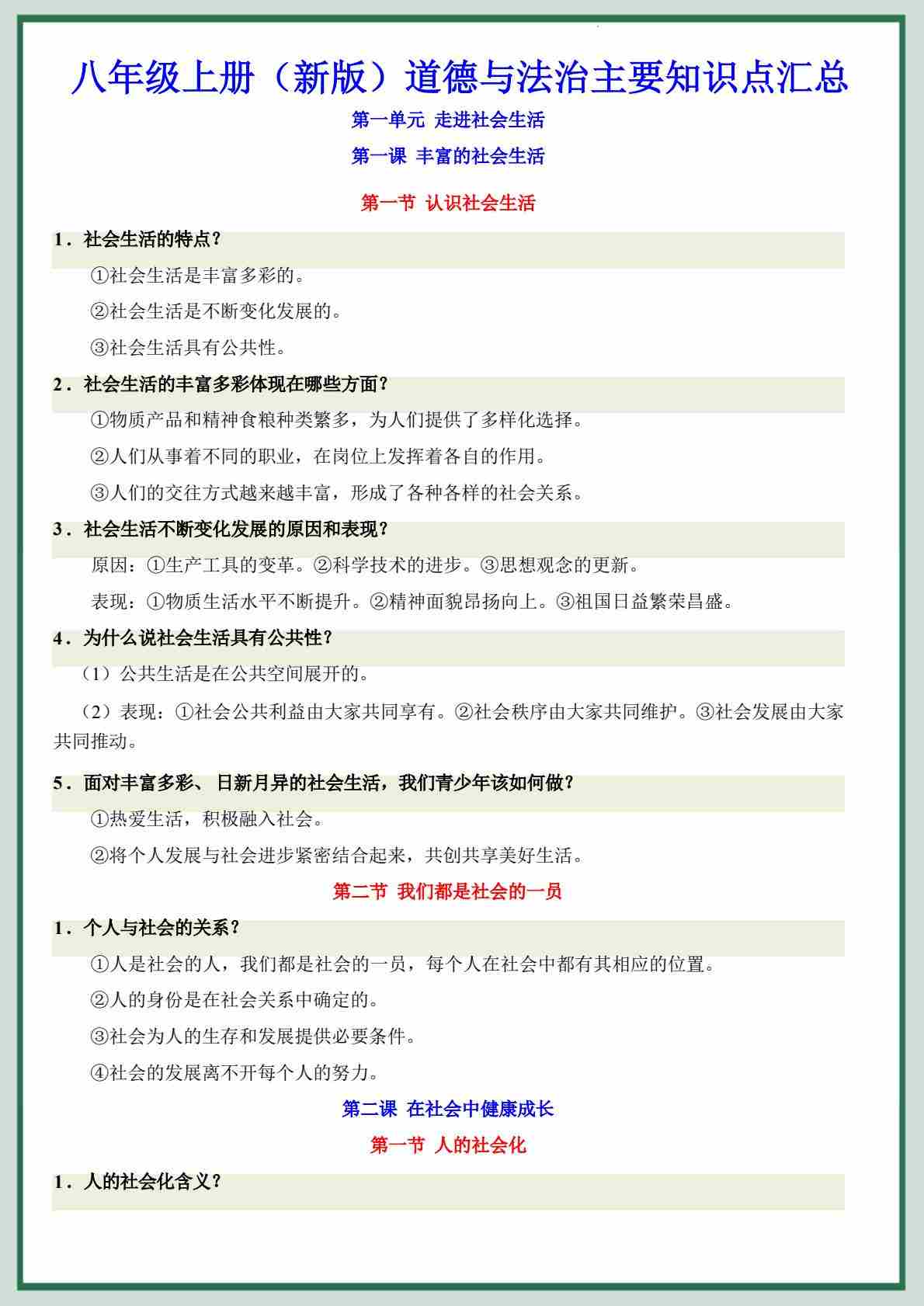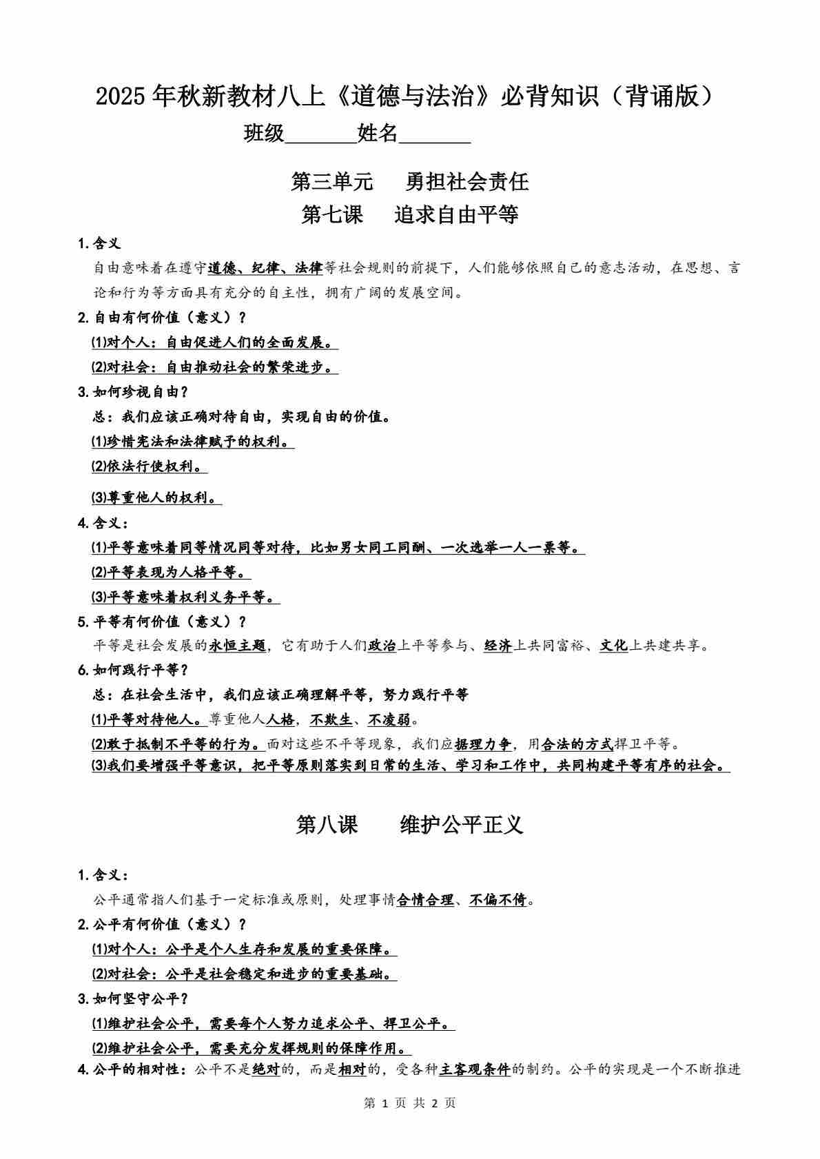 2025年秋新教材八上《道德与法治》第2单元必背知识(背诵版)