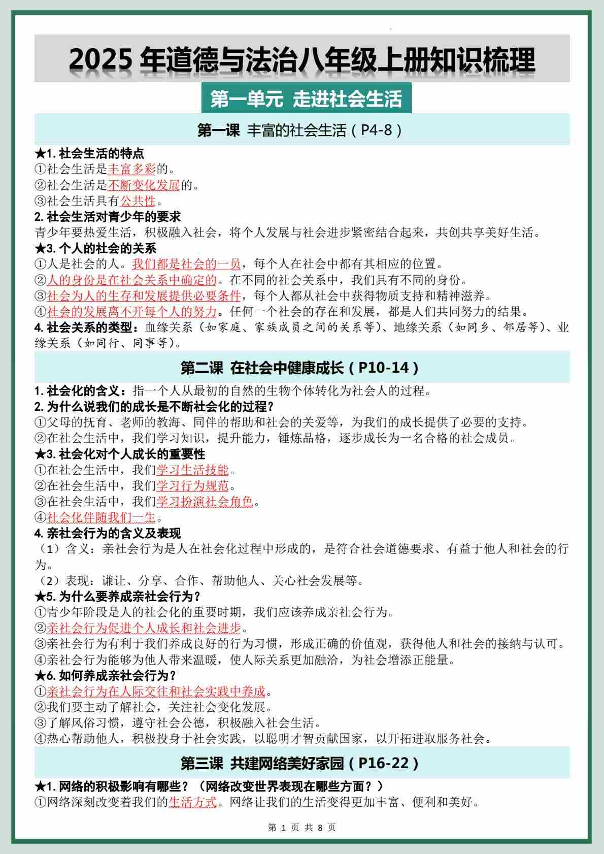 2025年秋新教材八上《道德与法治》第1单元必背知识(背诵版)