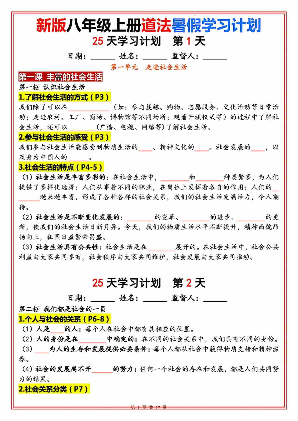 新版八年级上册道法(人教版)25天学习计划(填空版)