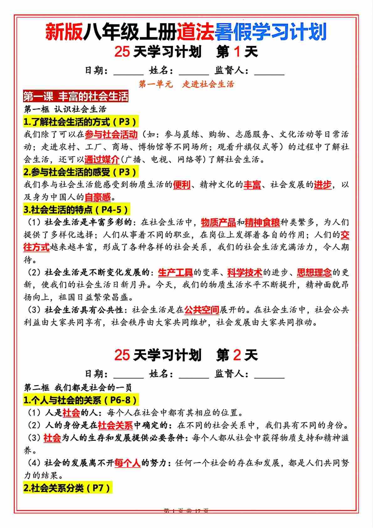 新版八年级上册道法(人教版)25天学习计划(答案版)