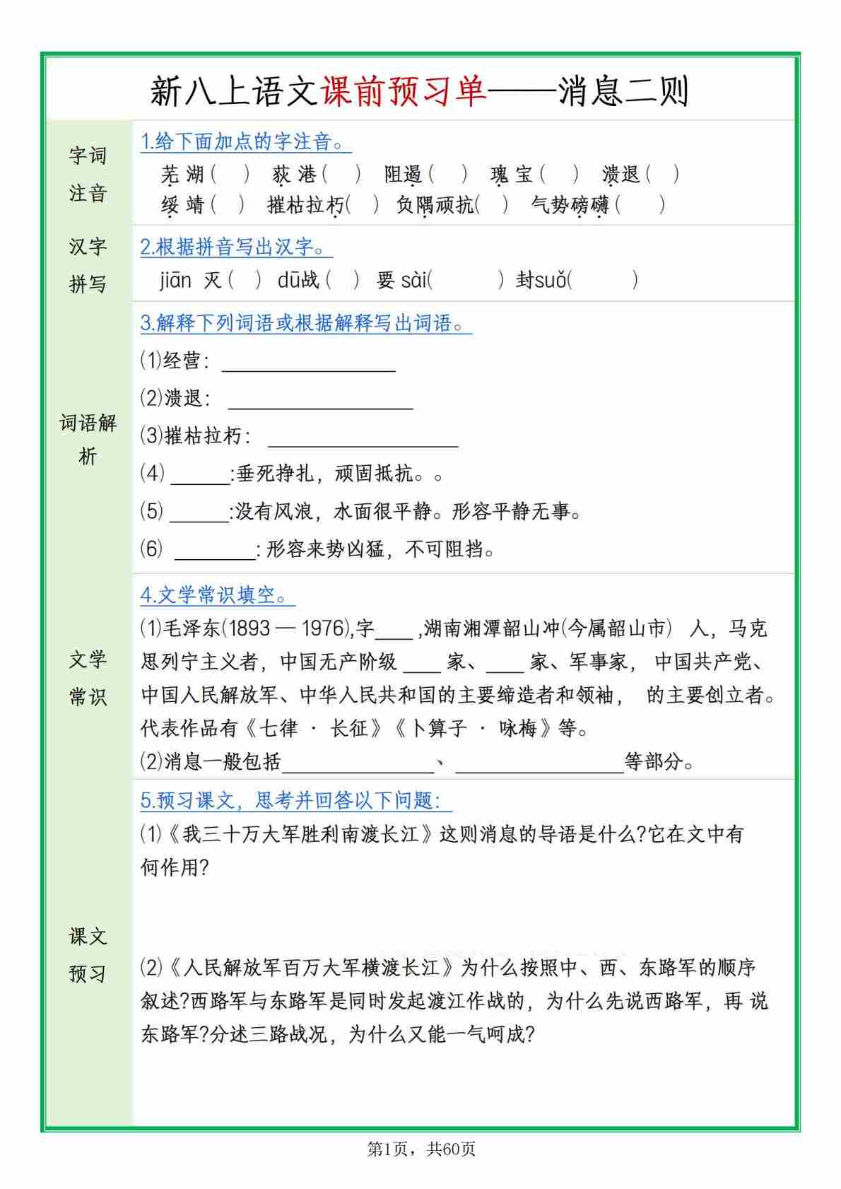【预习】25年新八上语文全册预习单