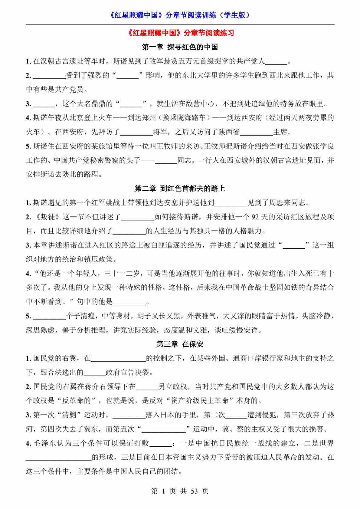 八上名著《红星照耀中国》分章节阅读训练