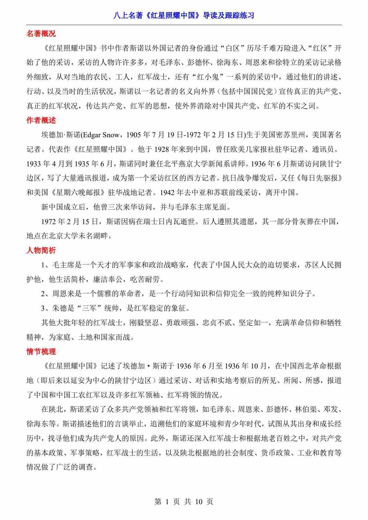 八上名著《红星照耀中国》导读及跟踪练习