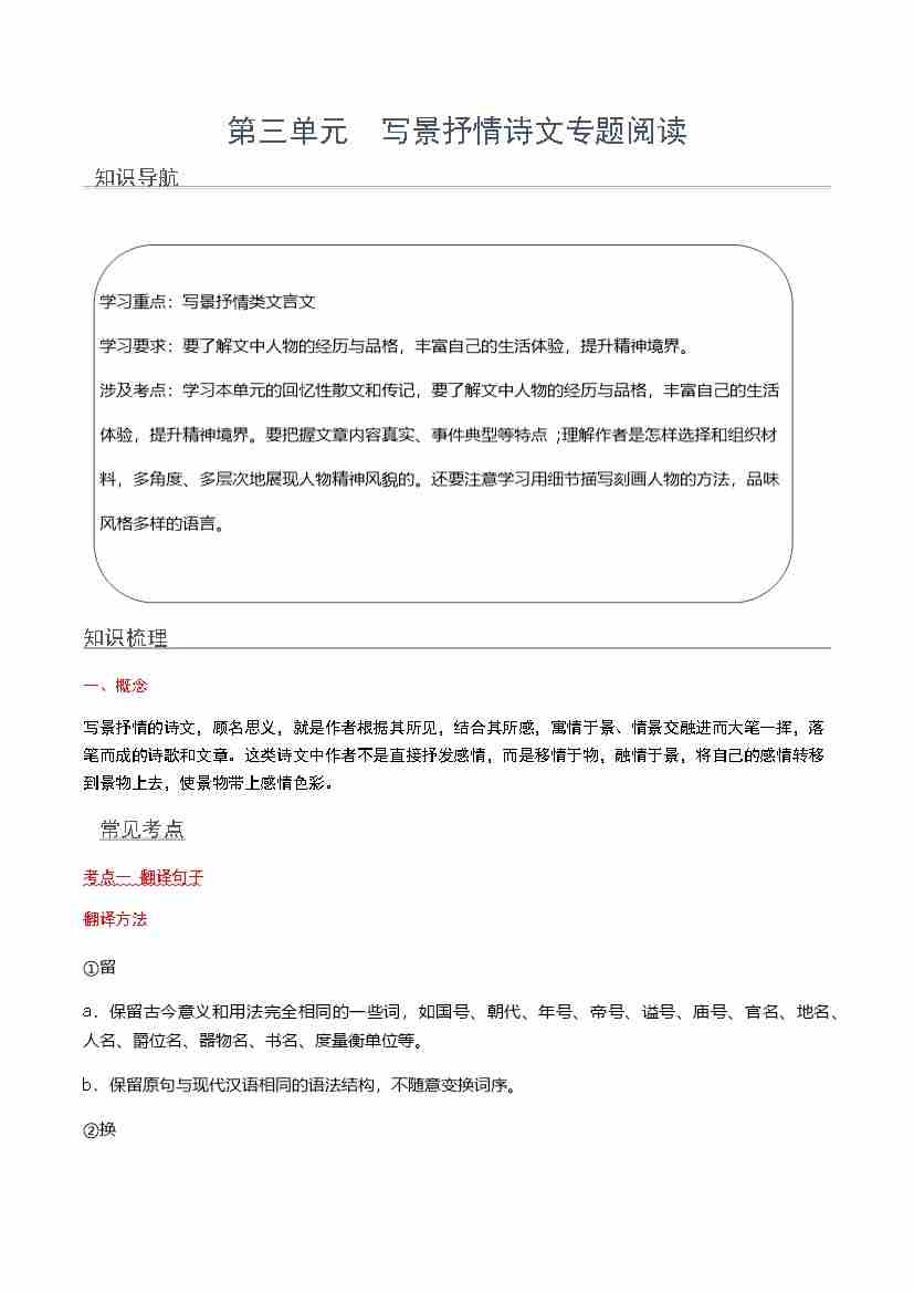第三单元 写景抒情诗文专题阅读(学生版)