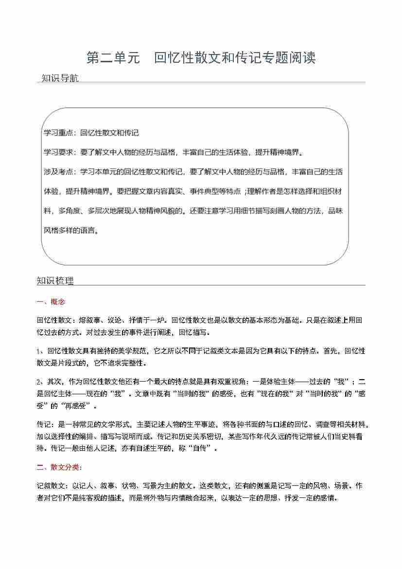 第二单元 回忆性散文和传记专题阅读(学生版)