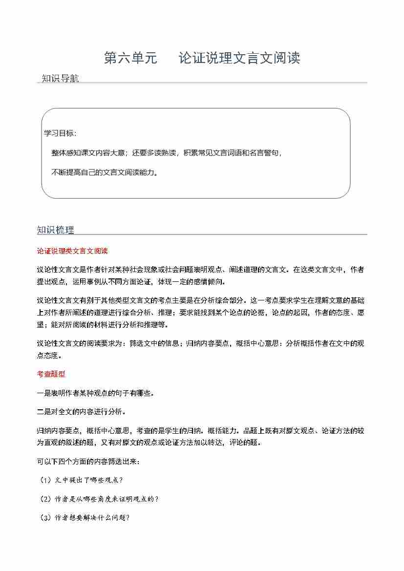 第六单元 论证说理文言文阅读(学生版)