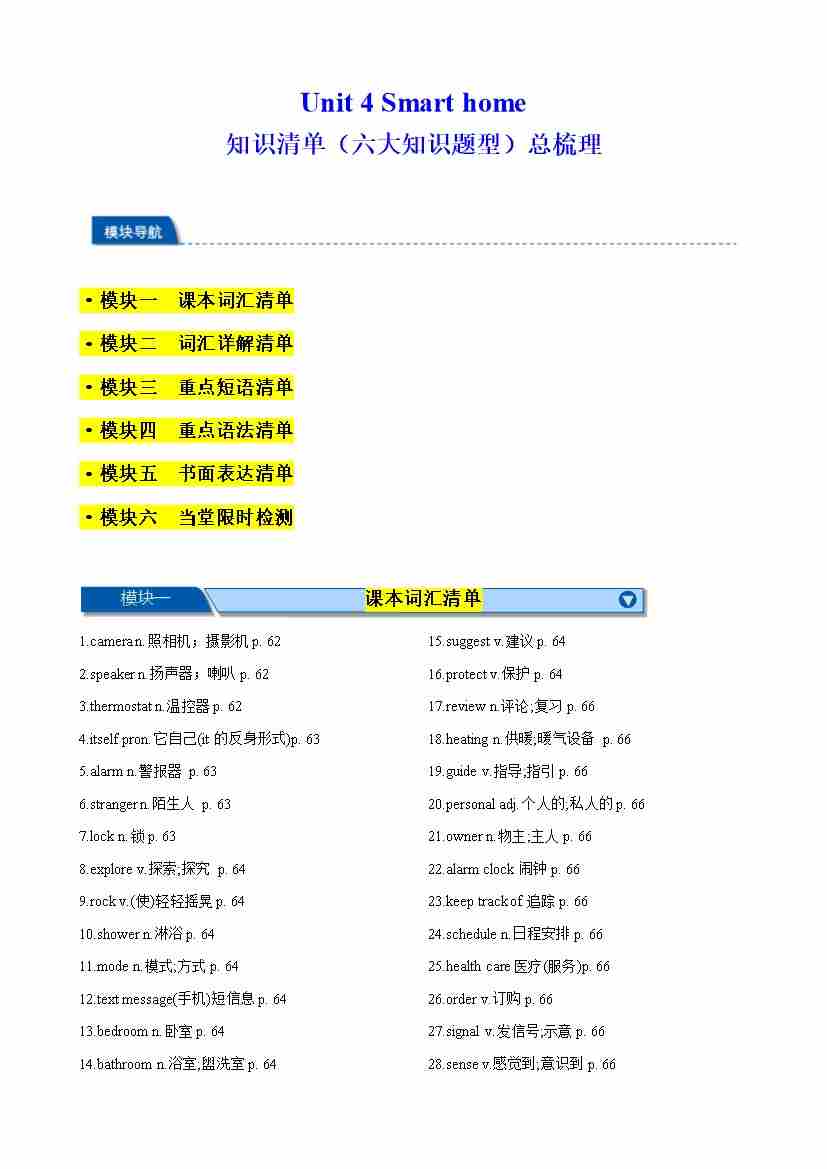 Unit 4 Smart home 知识清单(六大知识题型)总梳理(原卷版)