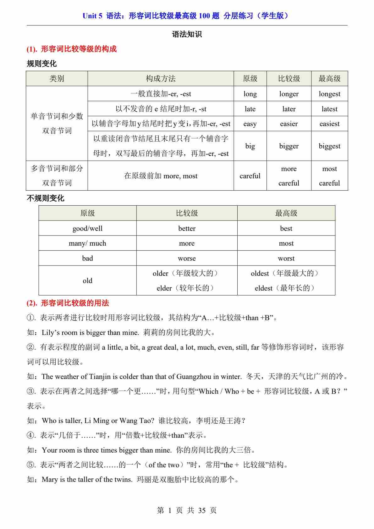 Unit 5 语法:形容词比较级最高级100题(分层练习)