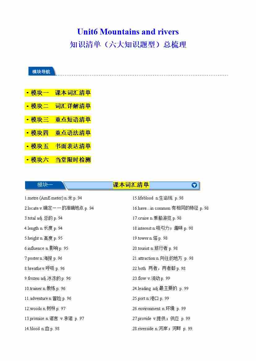 Unit 6 Mountains and rivers 知识清单(六大知识题型)总梳理(原卷版)