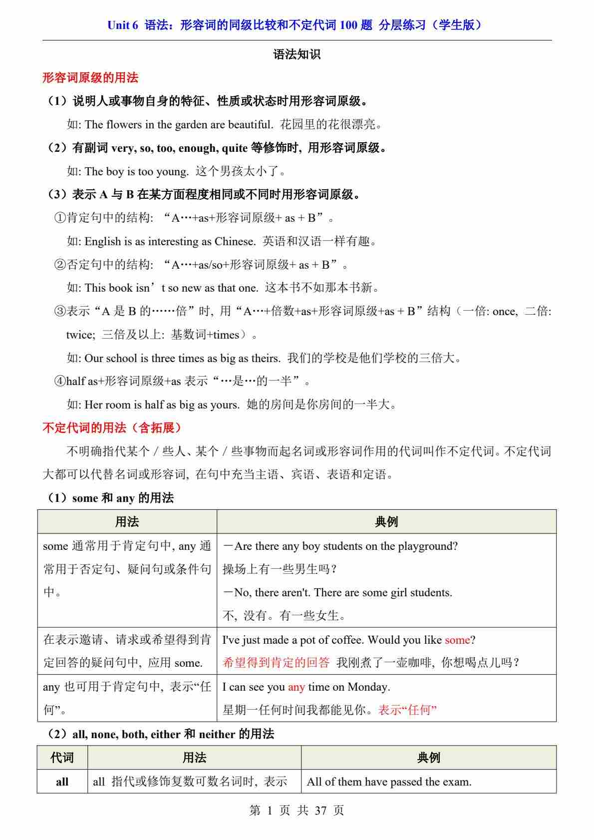 Unit 6 语法:形容词的同级比较和不定代词100题(分层练习)