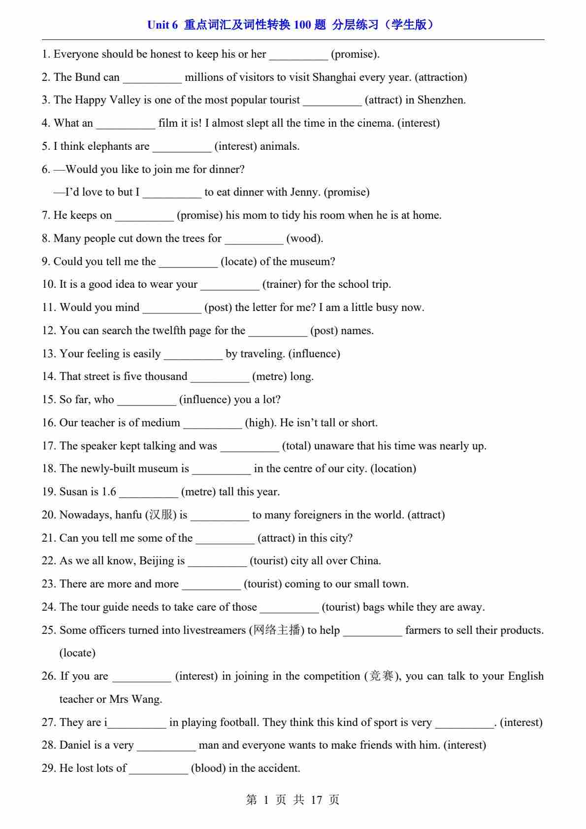 Unit 6 重点词汇及词性转换100题(分层练习)