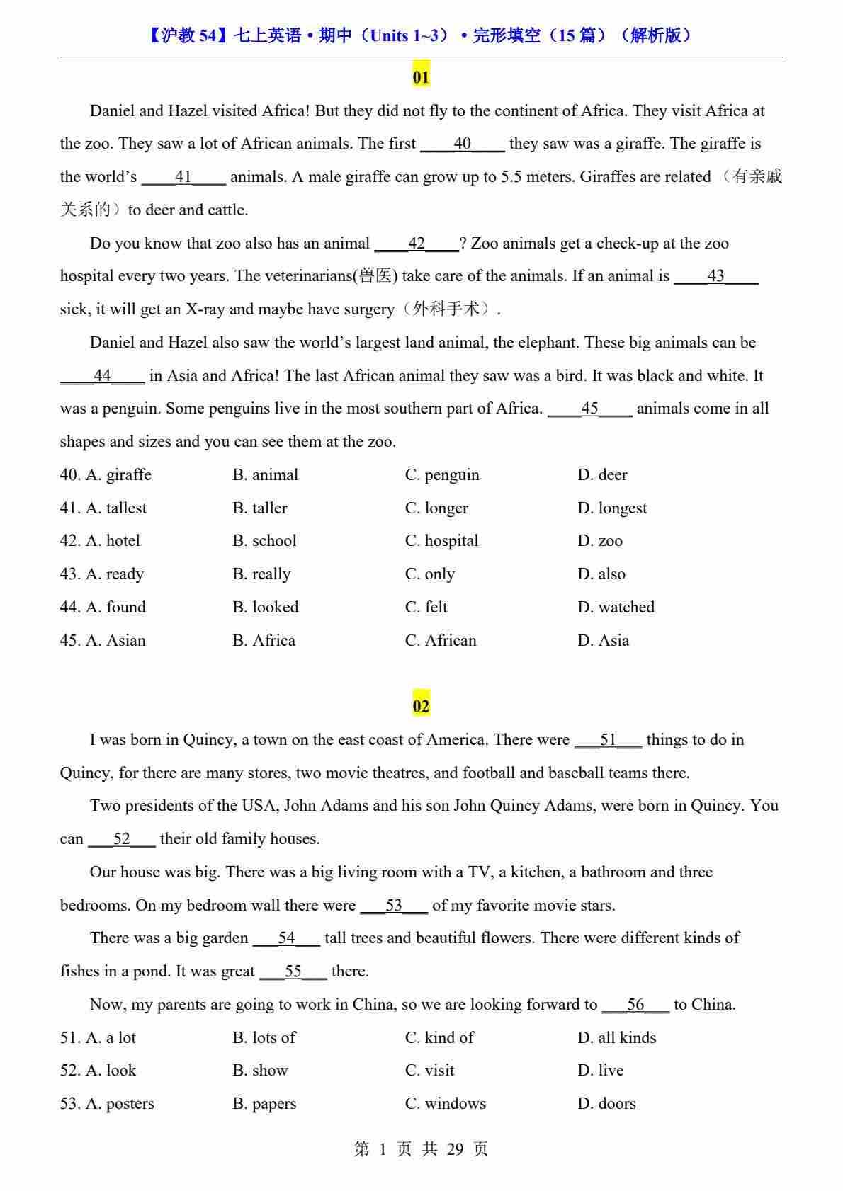【沪教54】七上英语期中完形填空15篇
