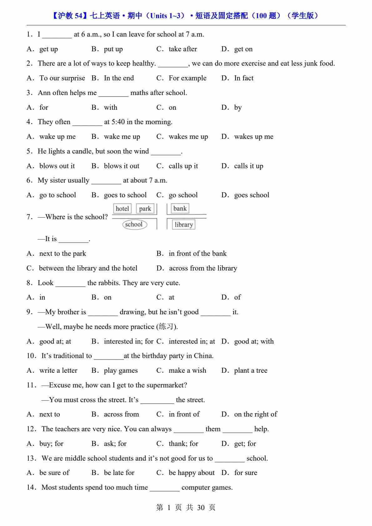 【沪教54】七上英语期中短语及固定搭配100题