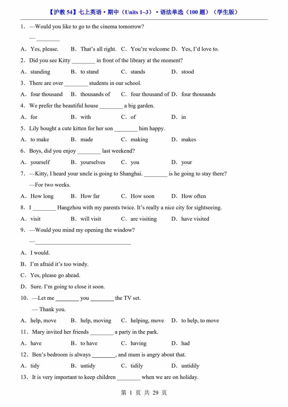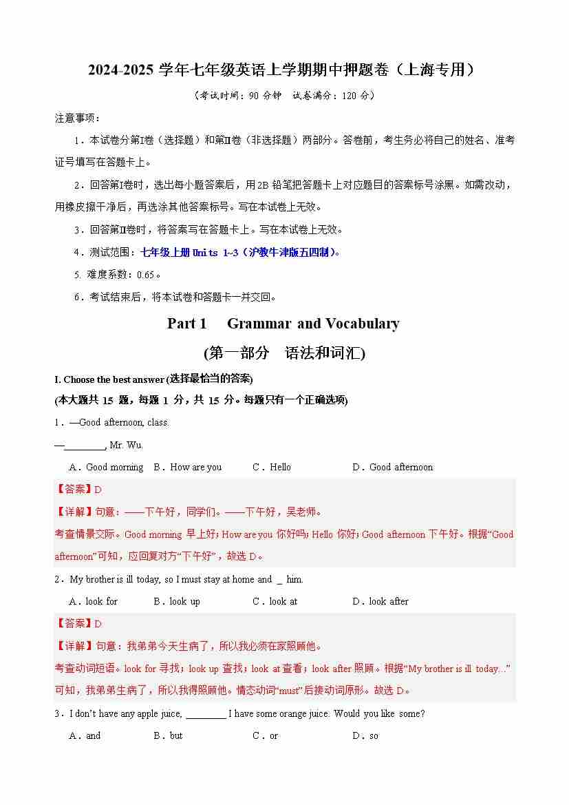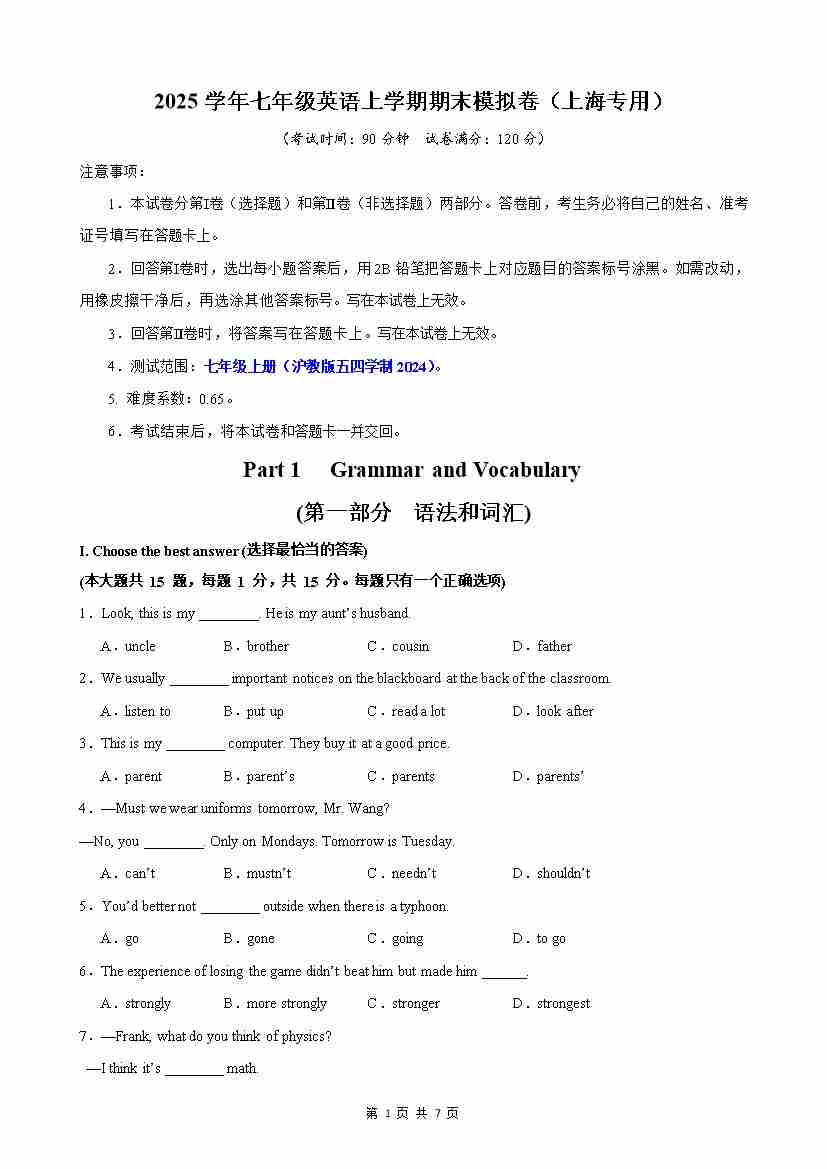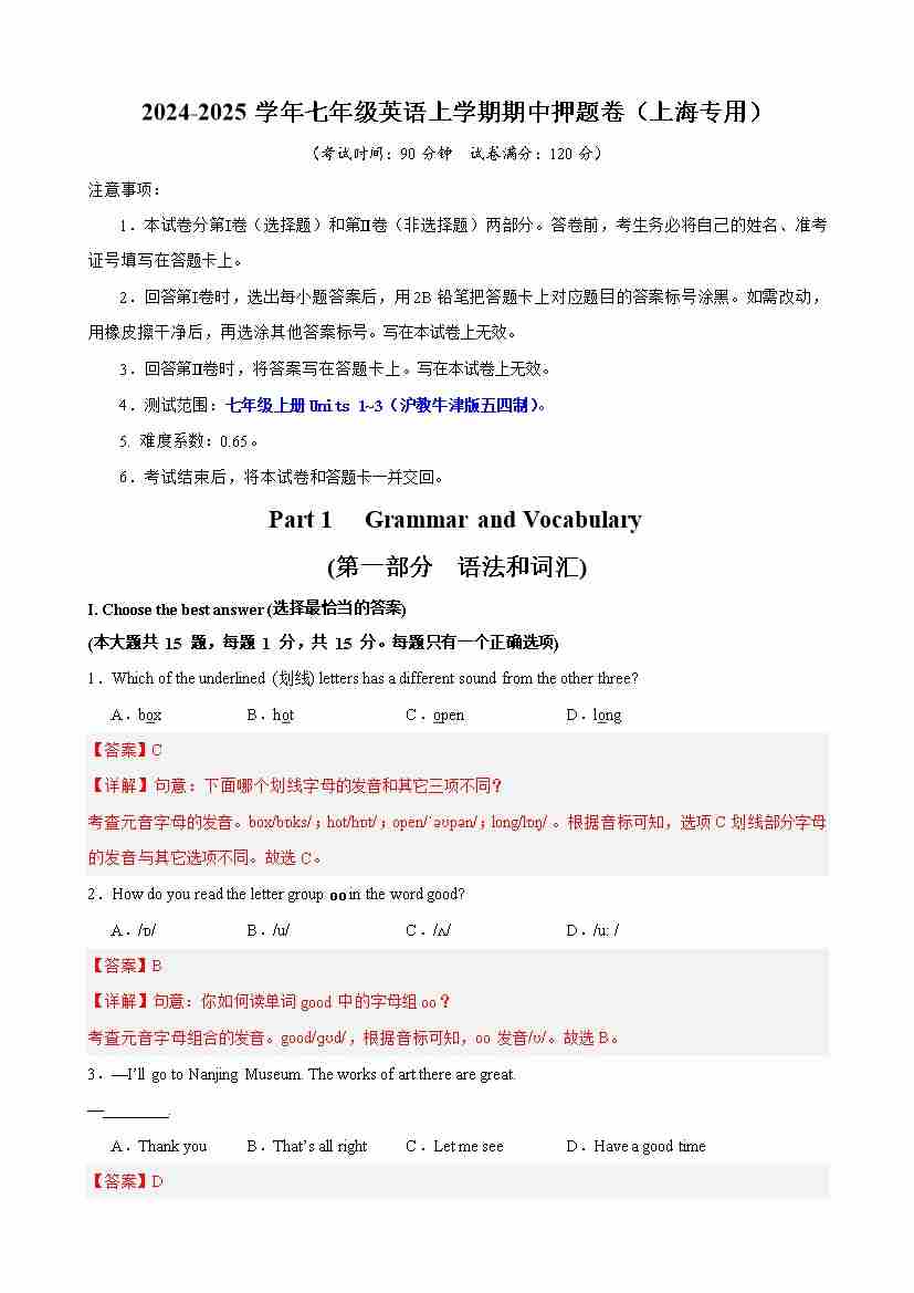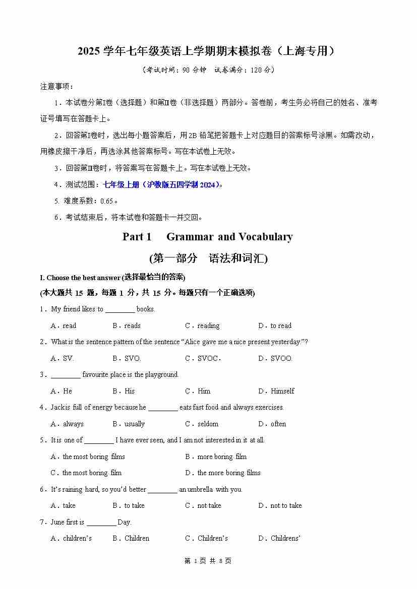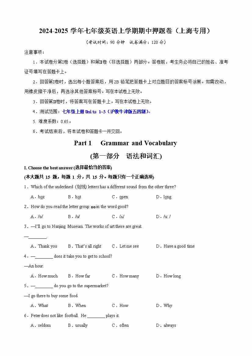 【沪教54】七上英语期中语法单选100题
