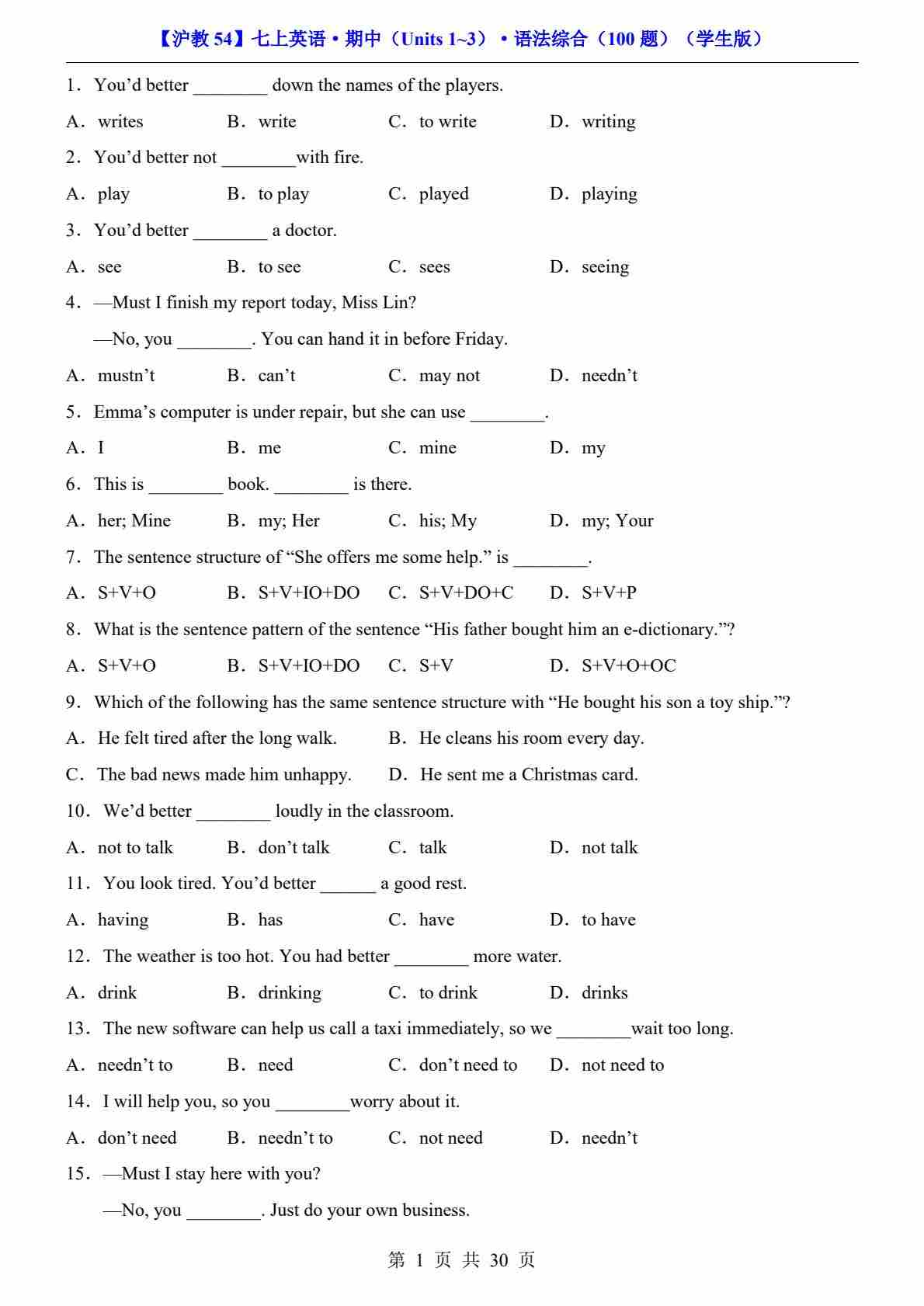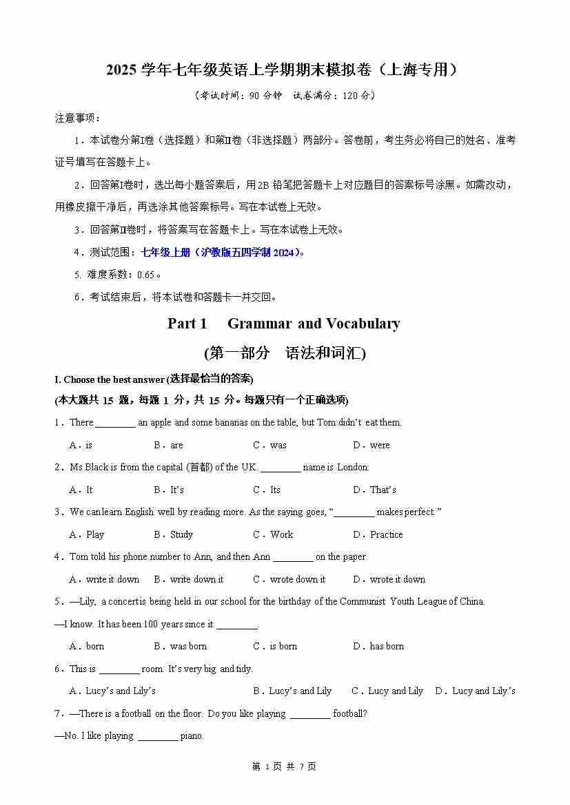 【沪教54】七上英语期中语法综合100题