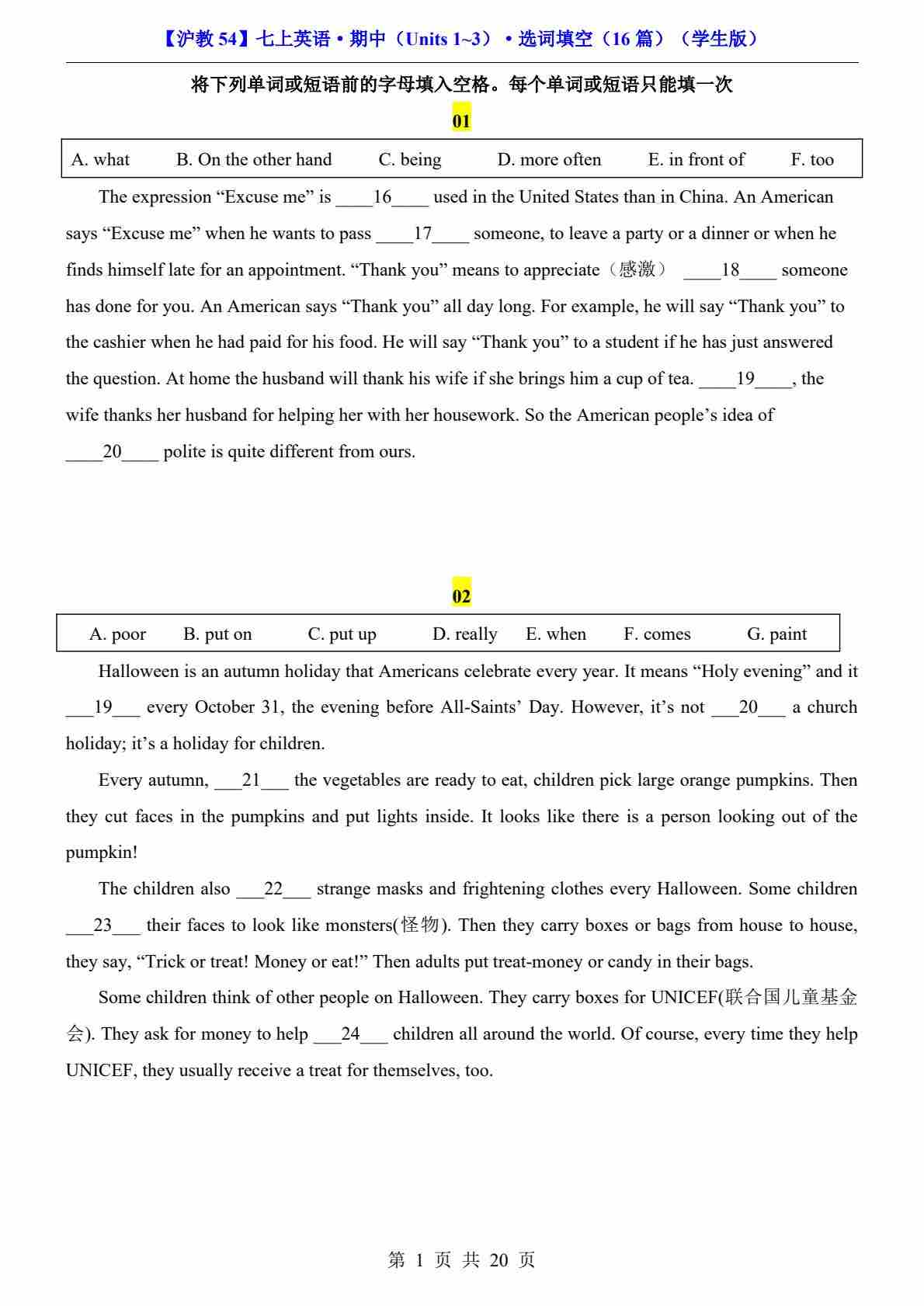 【沪教54】七上英语期中选词填空16篇
