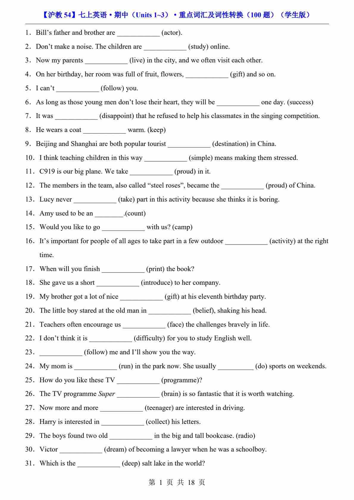 【沪教54】七上英语期中重点词汇及词性转换100题