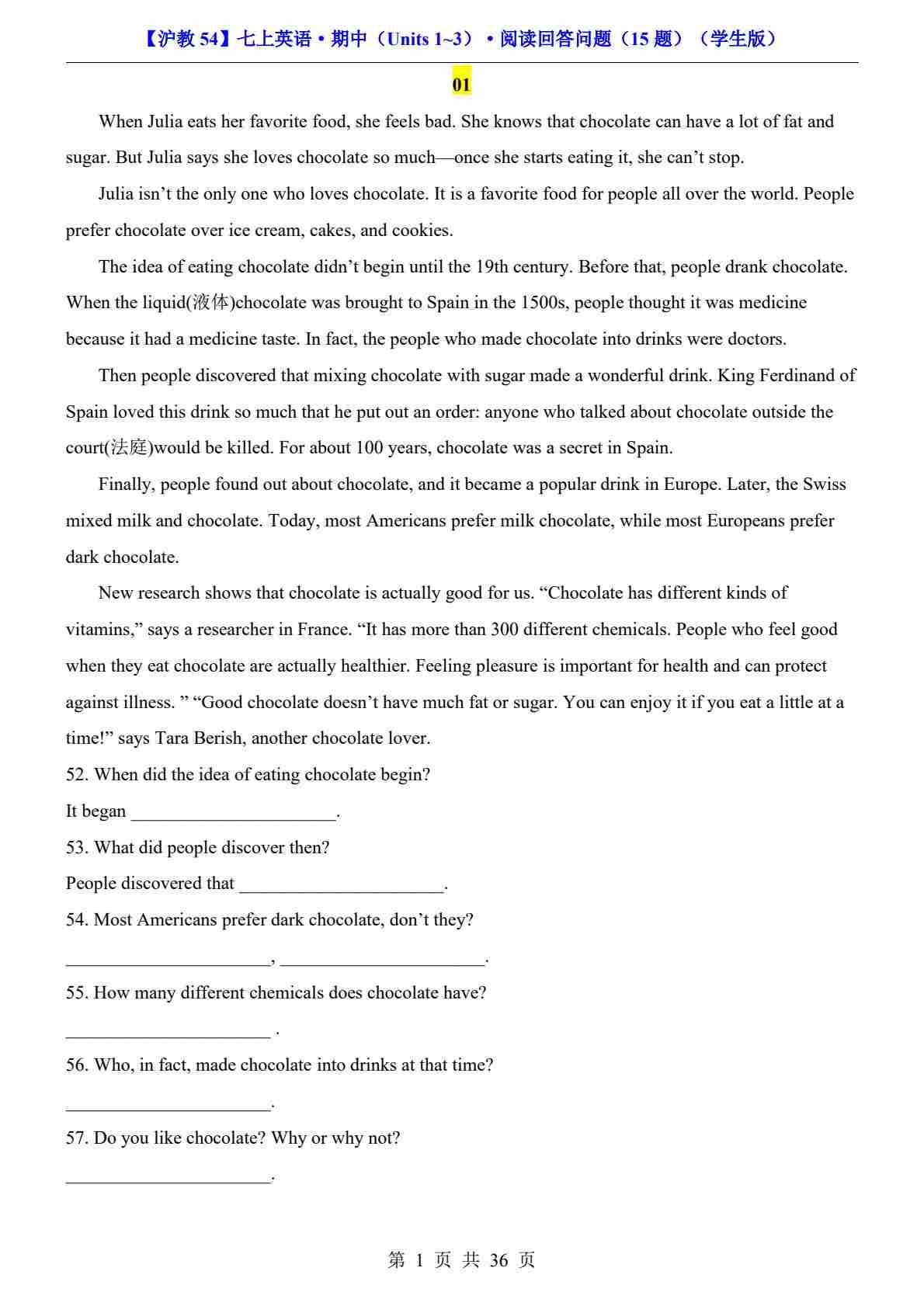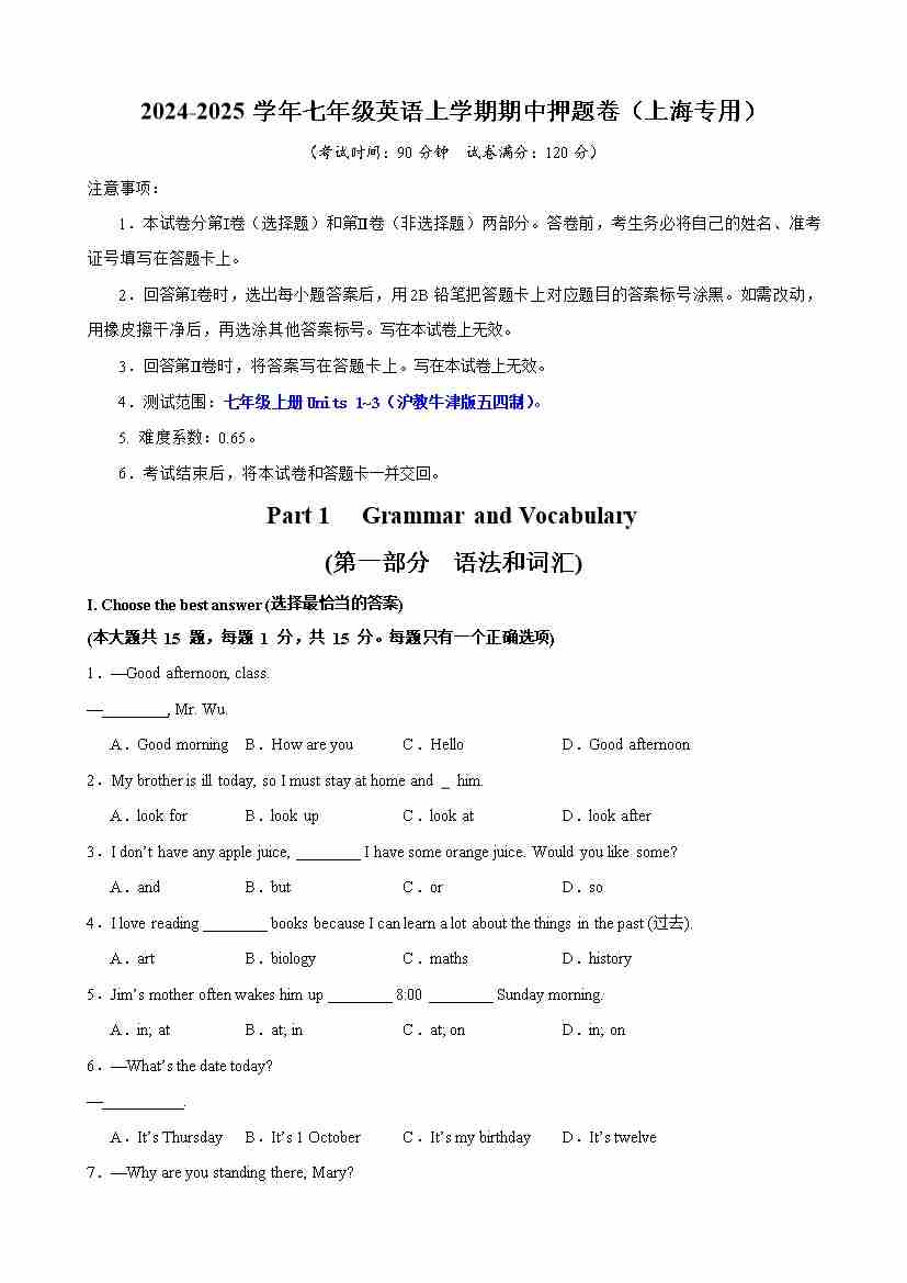 【沪教54】七上英语期中阅读回答问题15篇