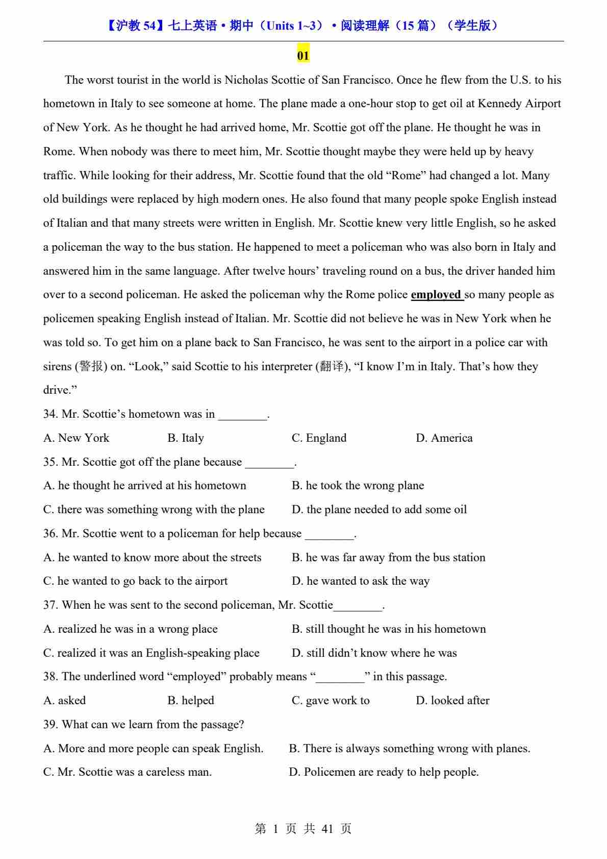 【沪教54】七上英语期中阅读理解15篇