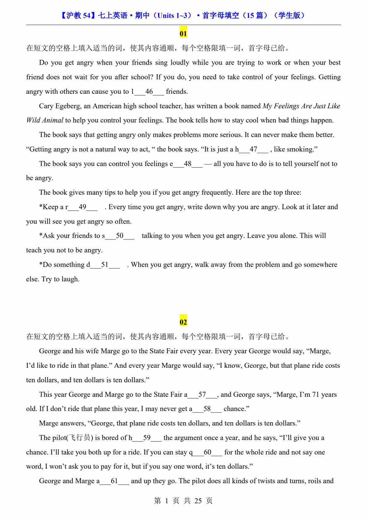 【沪教54】七上英语期中首字母填空15篇
